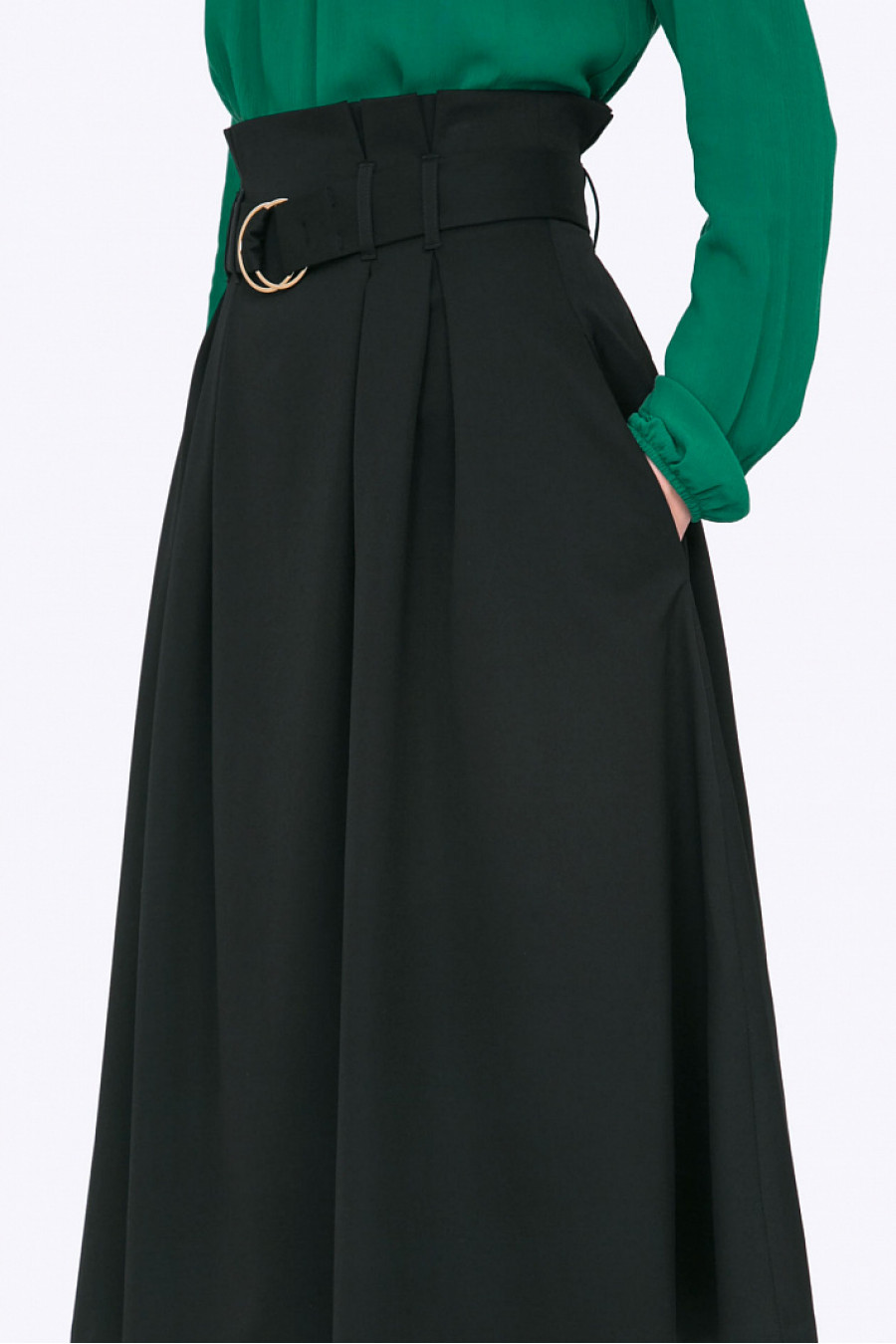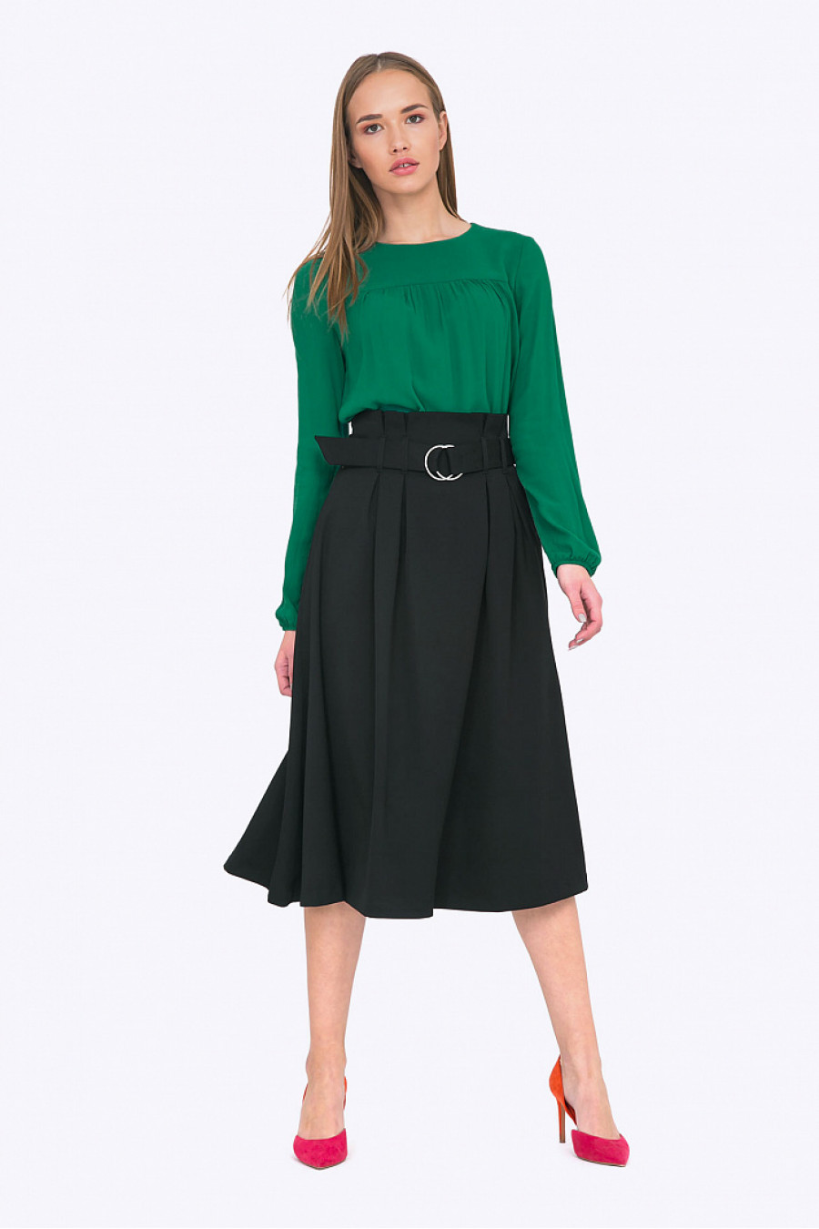 Уникальный дизайн этой модели не оставит равнодушными поклонниц индивидуального стиля. Продуманный безупречный крой высокой посадки стоечкой с заниженным поясом на пряжке - элегантно подчеркивает талию. Красиво ниспадающие складки мягкой ткани - формируют гармоничные линии слегка расклешенного подола. Скрытые в боковых швах карманы практичны и не нарушают силуэт. Юбка благородного черного цвета станет отличным выбором для создания эстетичных повседневных образов ( с водолазками и обтягивающими блузками пастельных тонов) или грациозных вечерних look-ов ( с яркими атласными или бархатными блузами из богатой ткани).Образ на фото дополнен Блузкой B2302-calvin. Модель без подкладки.