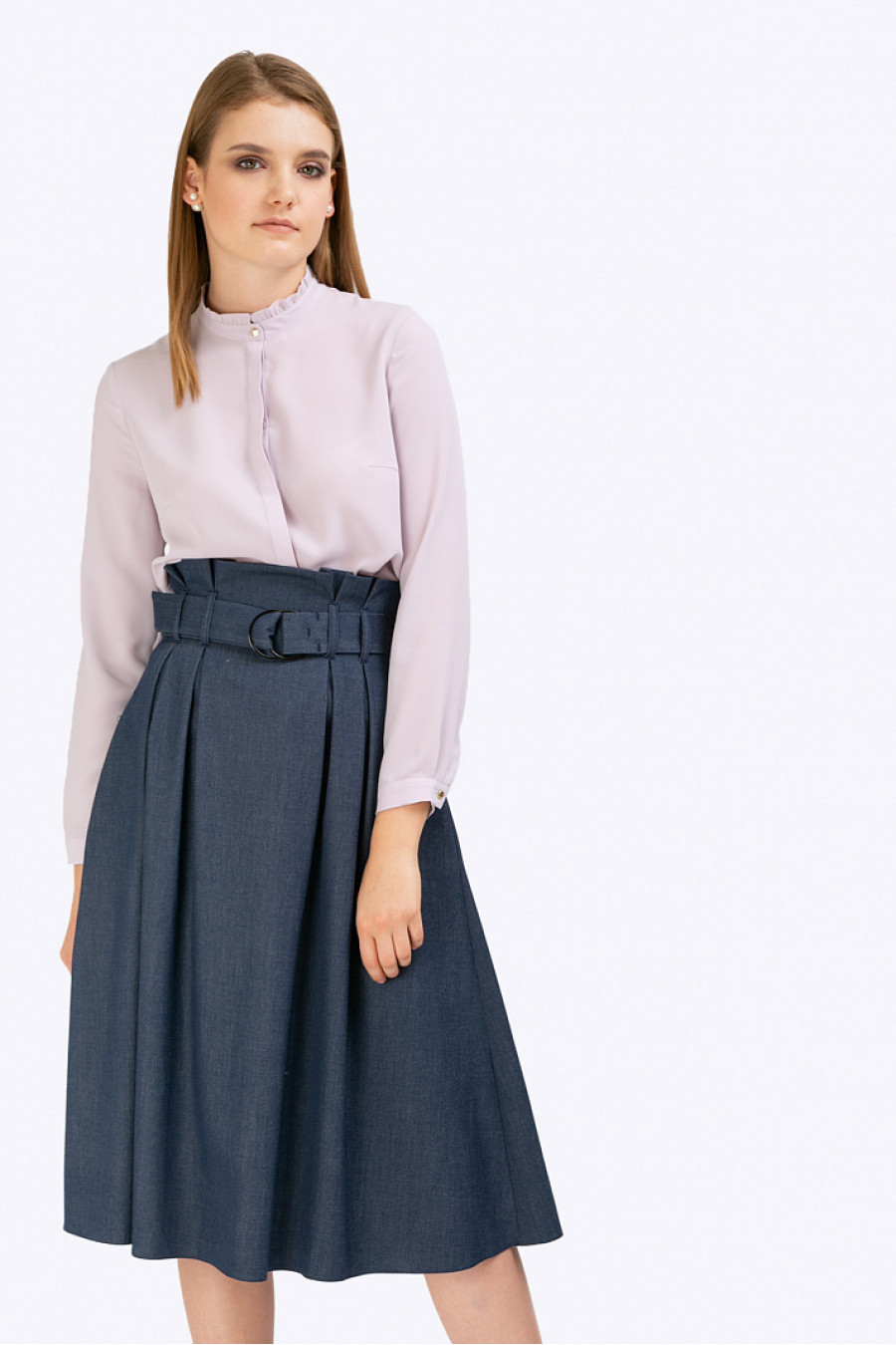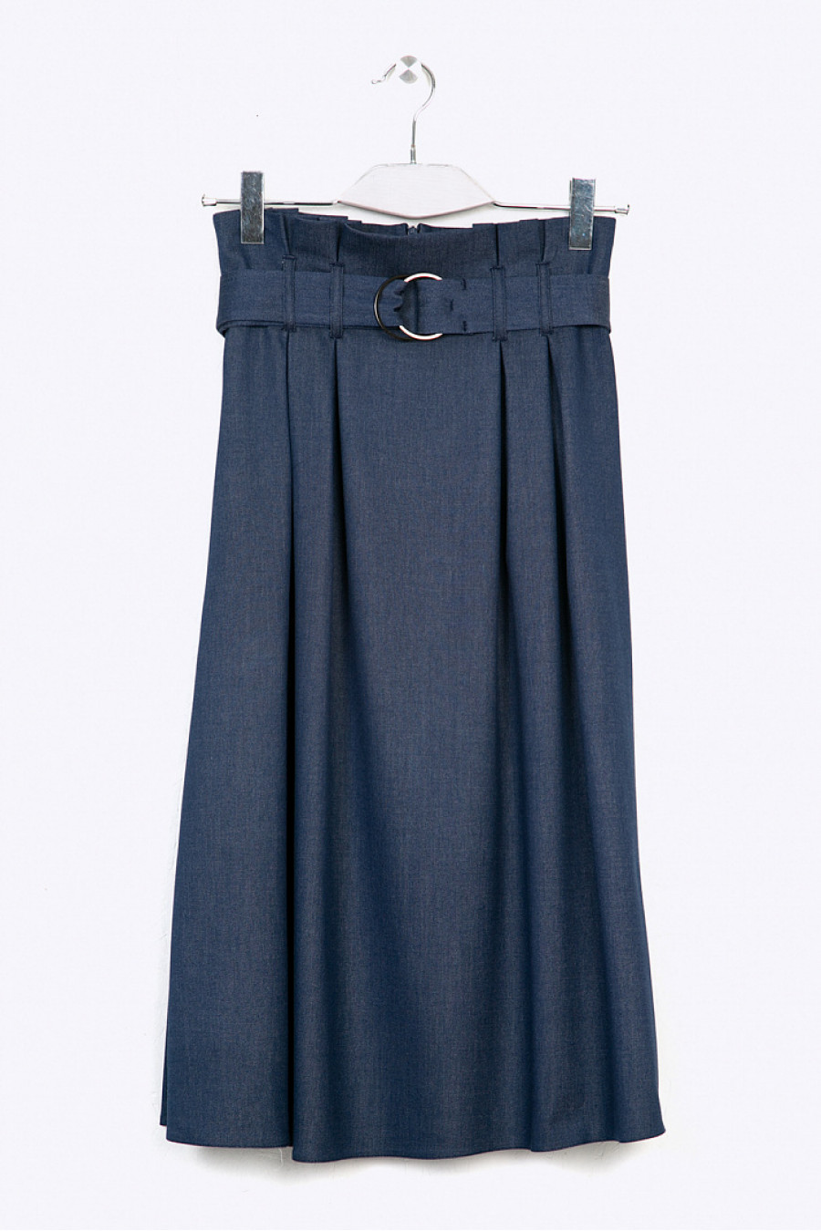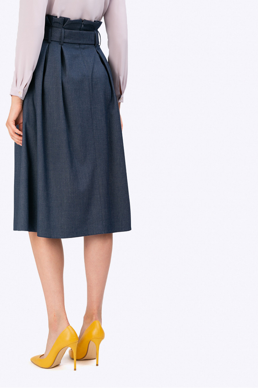 Тёмно-синяя юбка-миди с широкими складками у пояса. Ткань - меланж. Модель имеетзавышенную посадку, женственный трапециевидный силуэт, по формена поминающийперевёрнутый бутон, линия талии подчёркнута широким жёстким поясом сметаллическими кольцами, который помогает зрительно увеличить объём бёдер.Подходит для деловых поводов и прогулок. Юбка без подкладки. Рост фотомодели 177 см.
