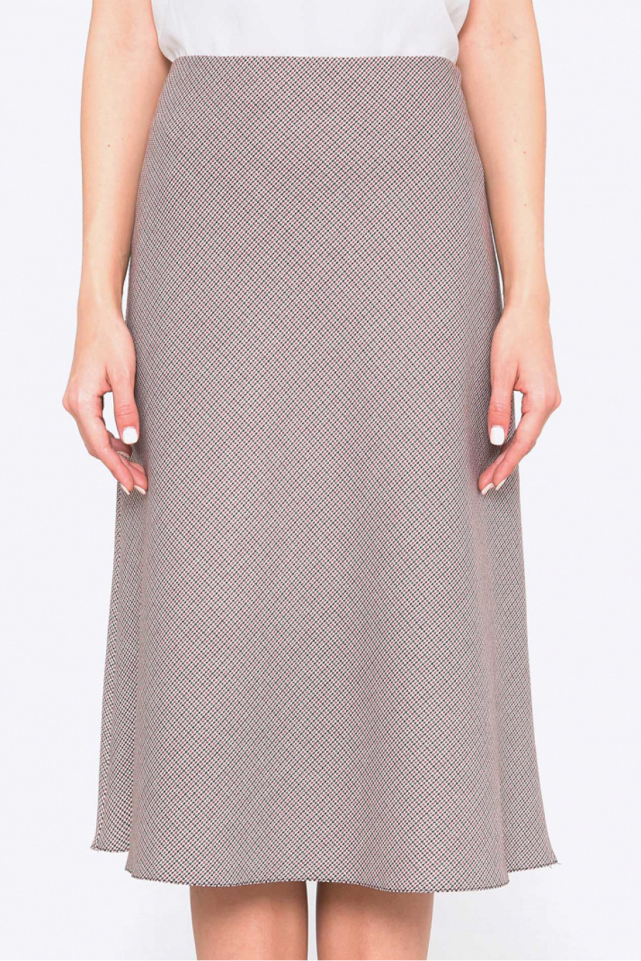 Юбка А-силуэта. Ткань плотная с мелким узором.Есть подкладка из полиэстера. Сбоку застежка-молния. Юбка хорошо сидит по фигуре, зрительно удлиняет силуэт, поможет создать женственный, притягательный образ.