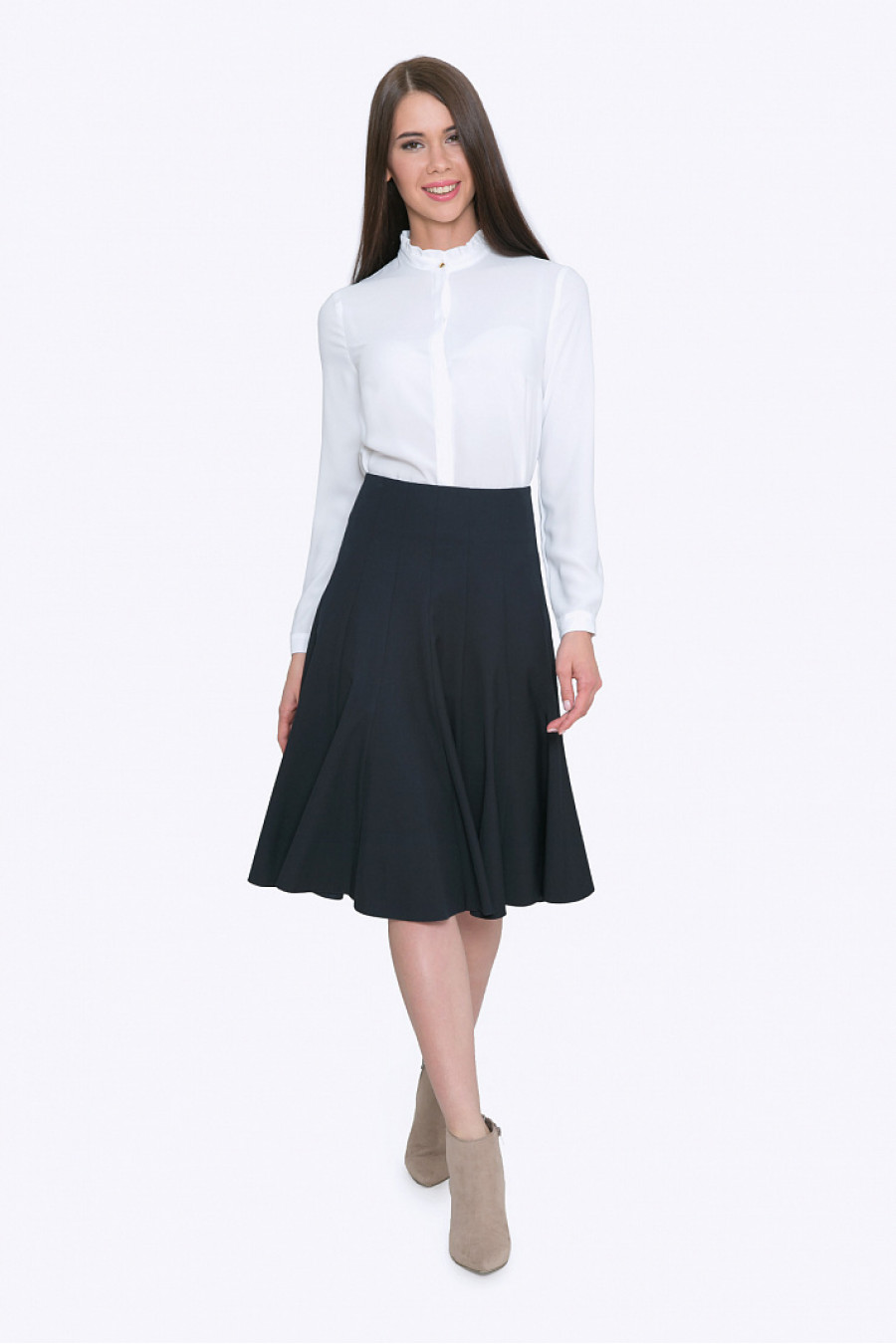 Расклешенная юбка с клиньями. Ткань средней плотности черного цвета. Есть подкладка из полиэстера. Модель хорошо сидит по фигуре. Прекрасная модель для делового образа или на каждый день. Рост фотомодели 172 см.