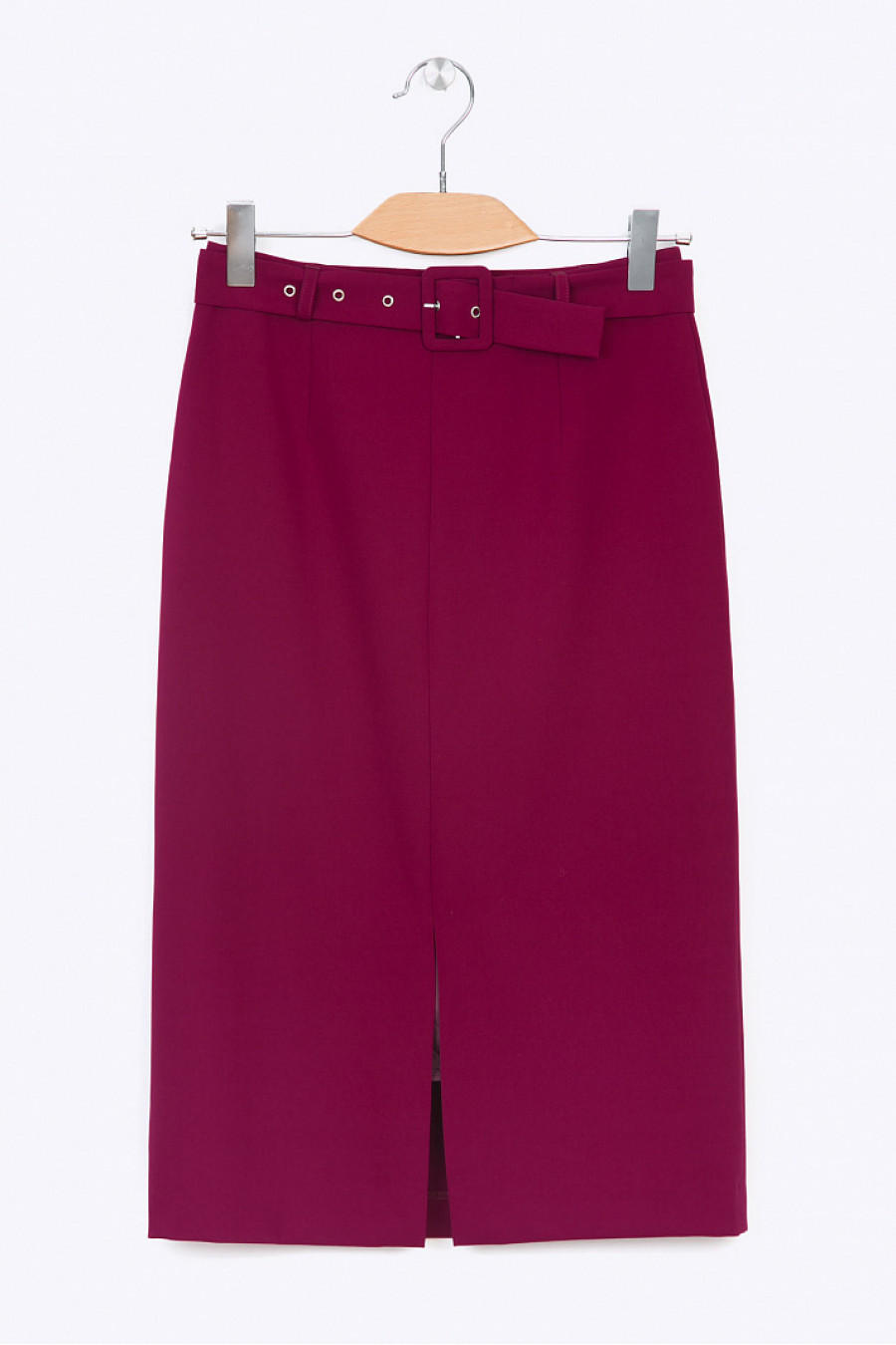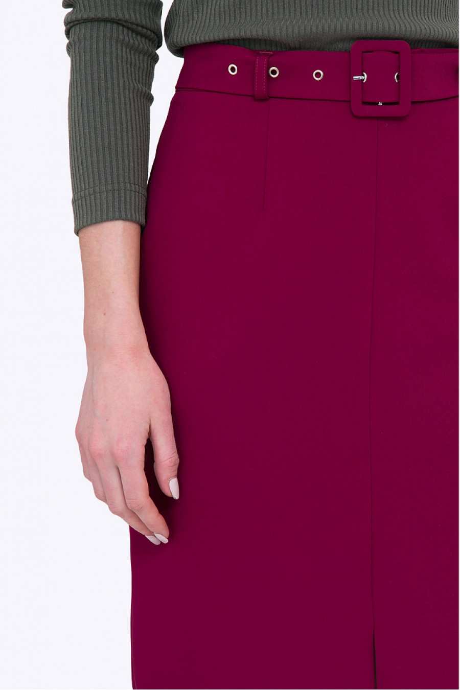 Яркая современная юбка-миди с выразительным разрезом - прекрасный образец актуального городского стиля. В сочетании с черными, алыми, белыми деталями насыщенный малиновый оттенок смотрится идеально. Стильный пояс подчеркивает эстетику модели.