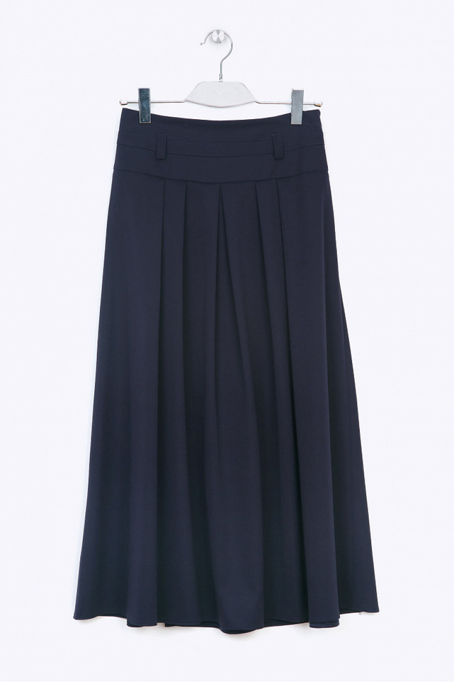 Синяя юбка А-силуэта на широкой кокетке. Модель имеет высокуюпосадку, основное внимание сконцентрировано на передней части кокетки, оформленнойшлёвками с имитацией пояса. Расположенные под ней складки обеспечивают юбке с