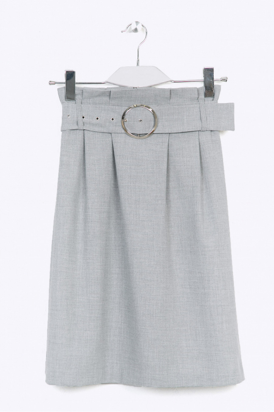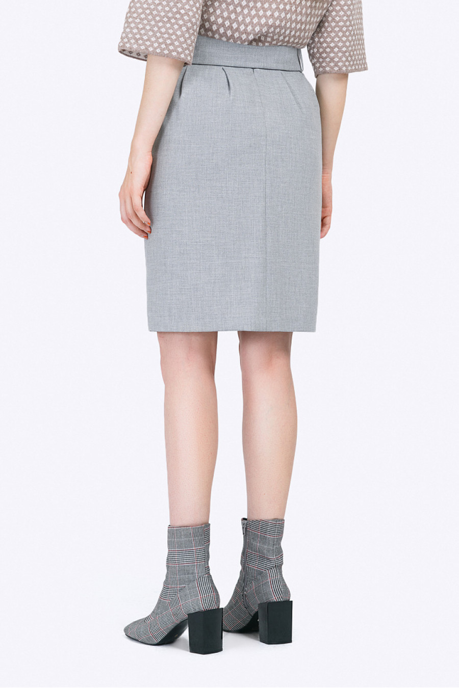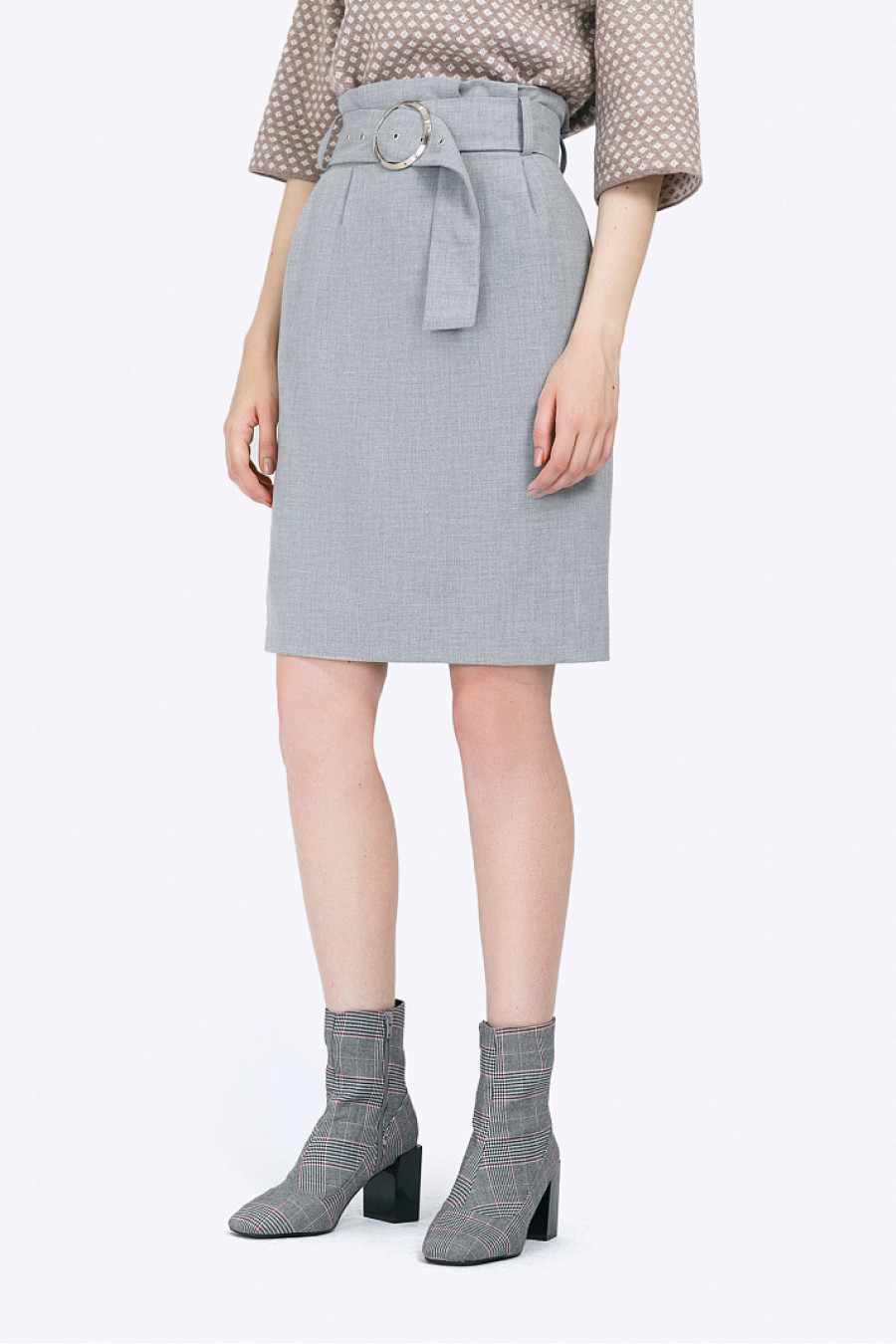 Юбка длиной до колена. Модель с плавными женственными линиями, зрительно увеличивающими объём бёдер. Завышенная линия талии сформирована расходящимися складками и жёстким поясом с крупной металлической пряжкой в форме кольца. В среднем заднем шве расположена застёжка«молния»