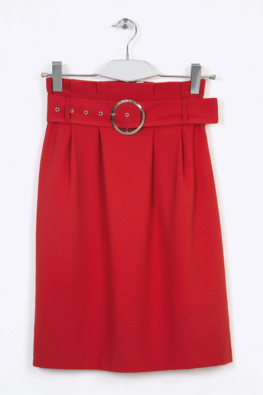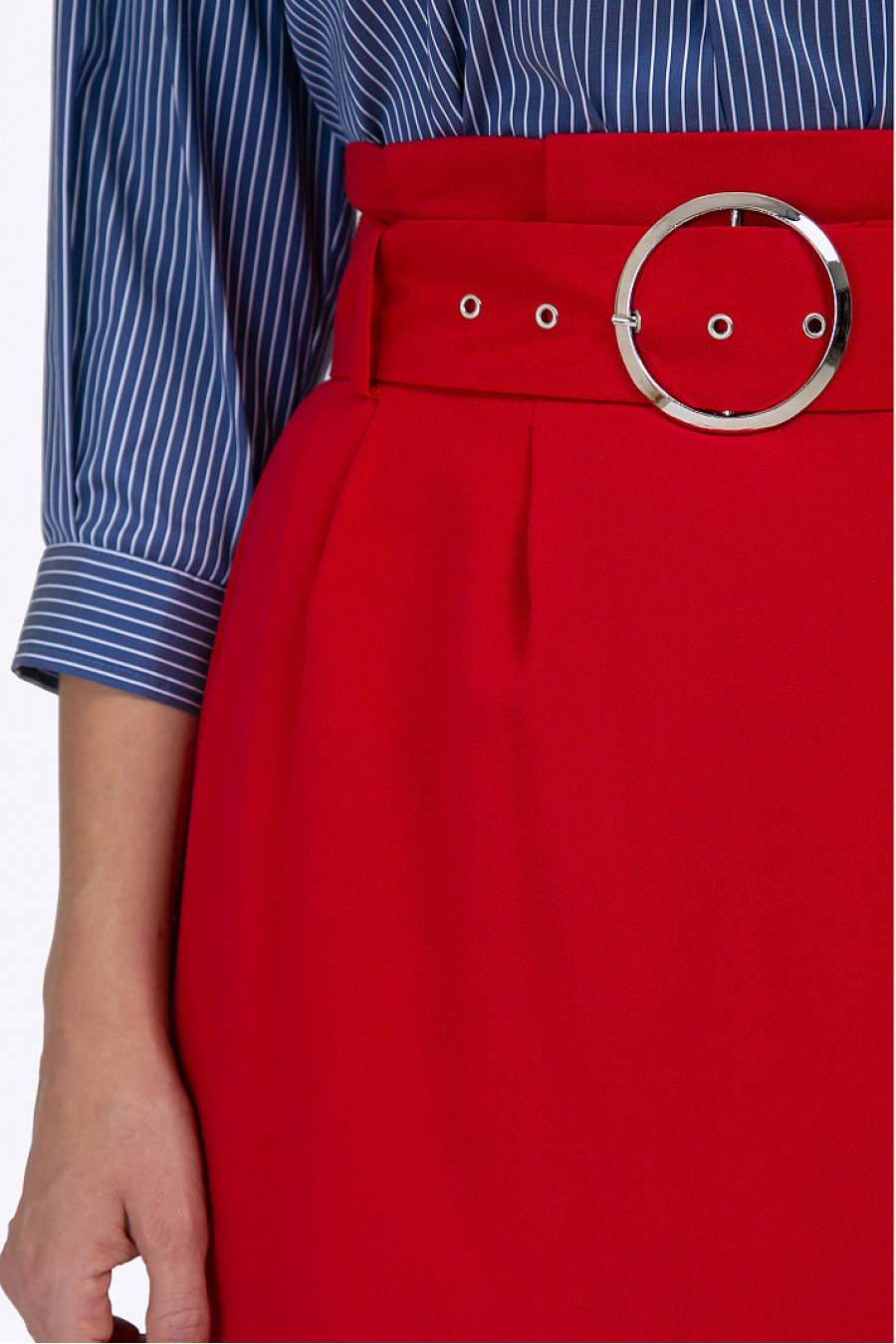 Юбка длиной до колена. Модель с плавными женственными линиями, зрительно увеличивающими объём бёдер. Завышенная линия талии сформирована расходящимися складками и жёстким поясом с крупной металлической пряжкой в форме кольца. В среднем заднем шве расположена застёжка«молния»