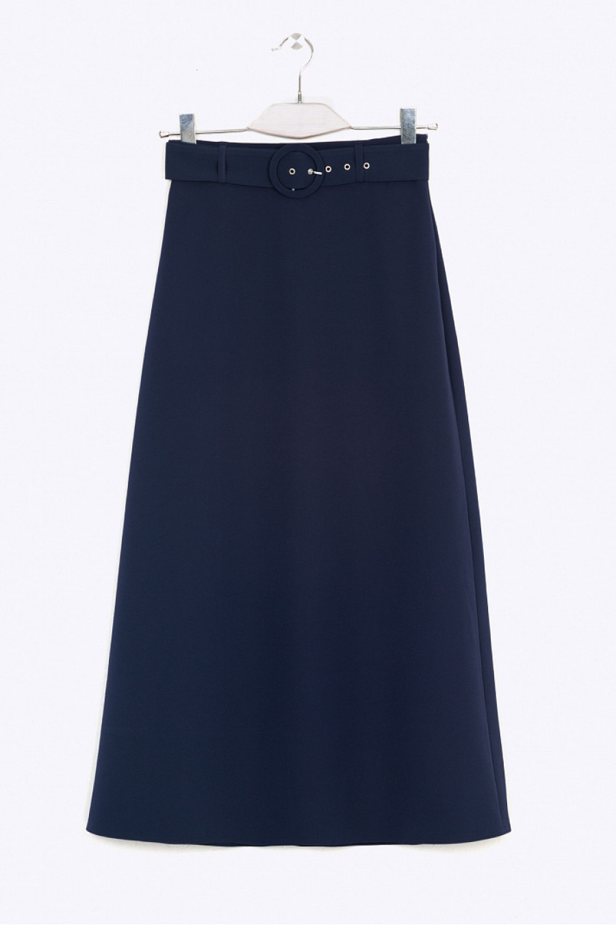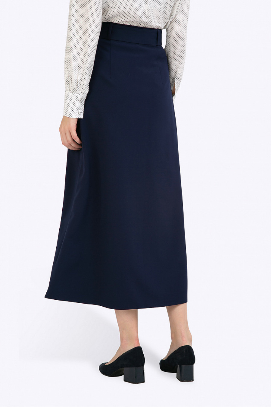 Темно-синяя юбка-миди на подкладке в форме трапеции. Модель имеет застёжку молнию в боковом шве.Основной акцент делается на подчёркивающий линию талии широкий пояс с крупной,обтянутой тканью пряжкой круглой формы. Рост фотомодели 176 см.