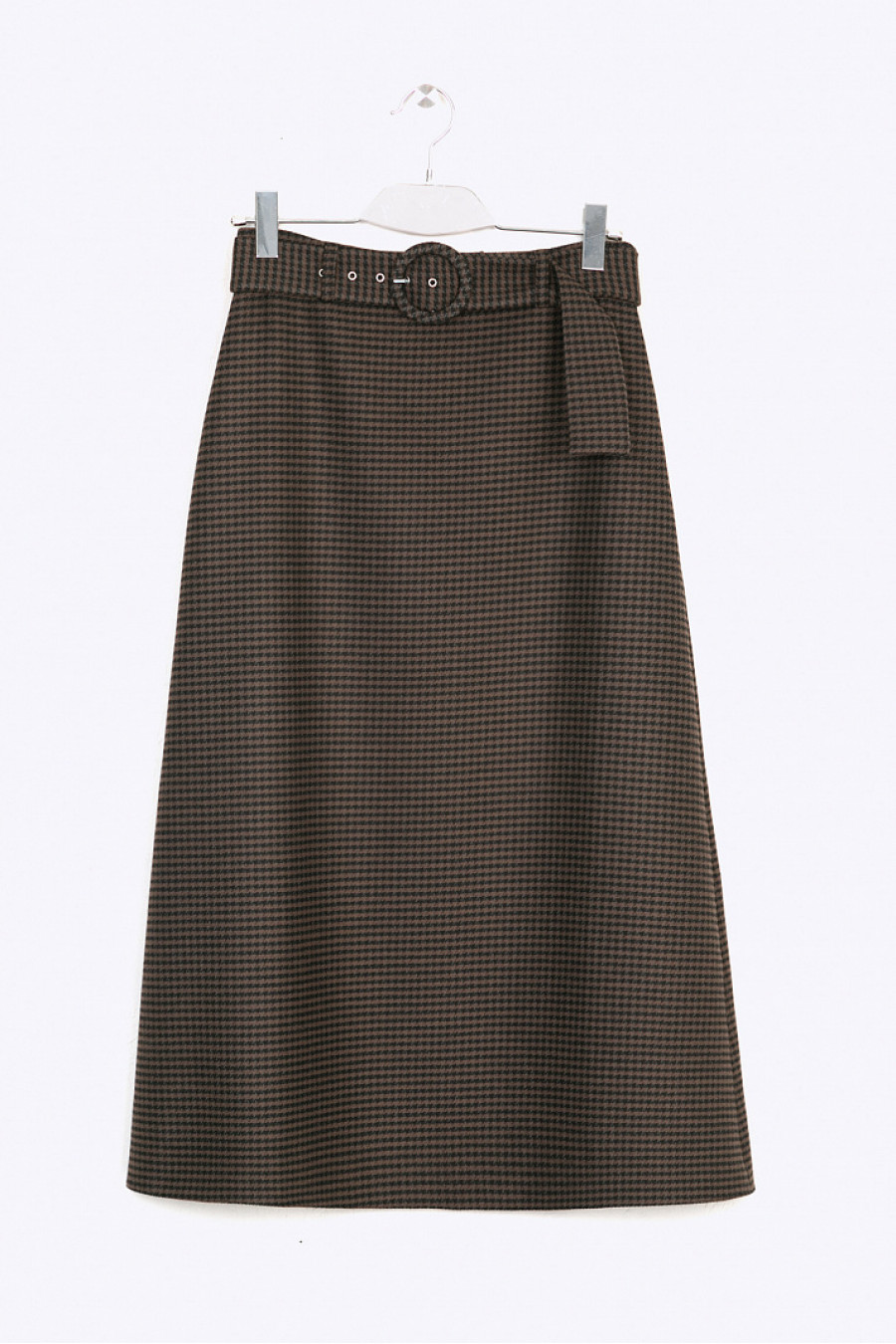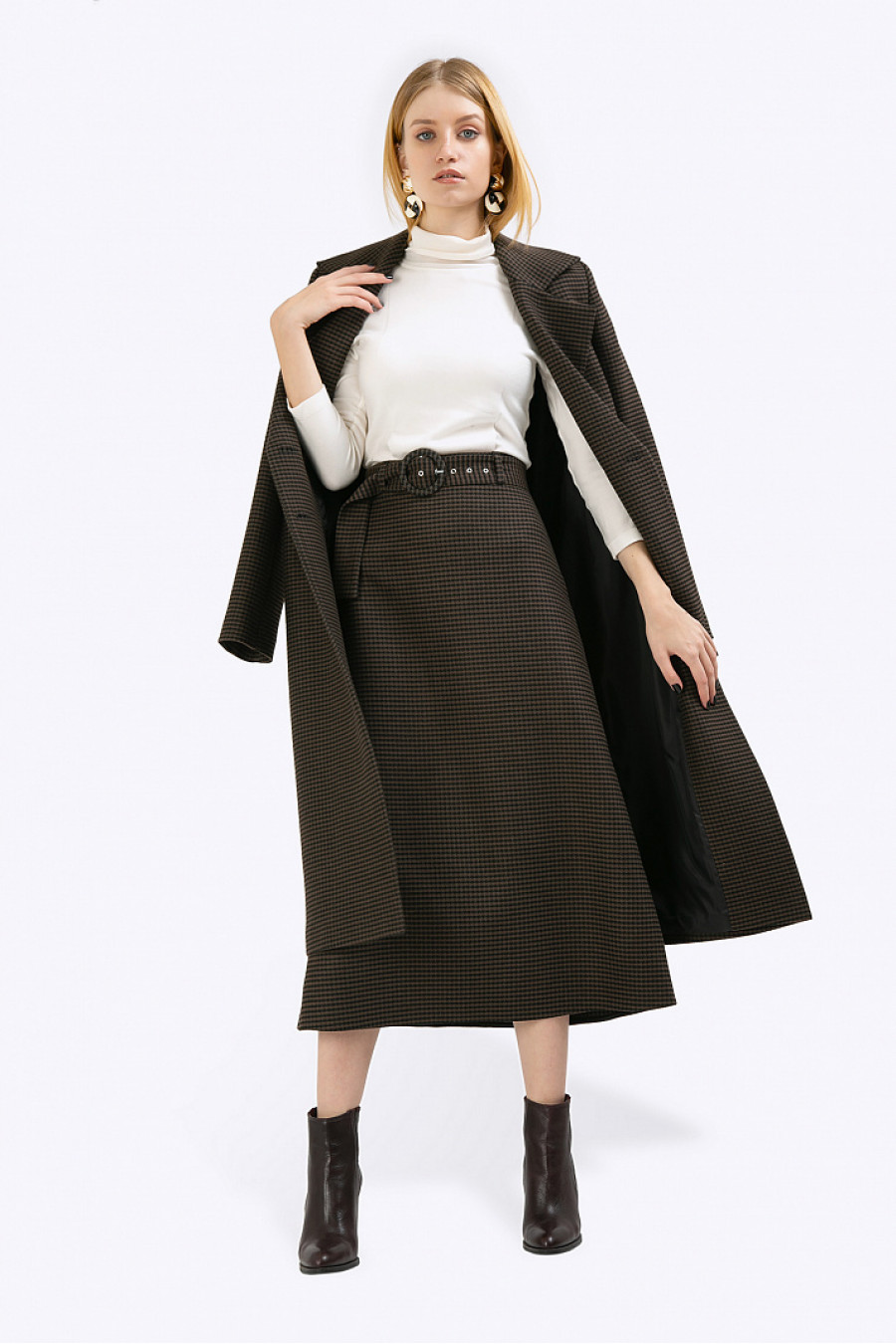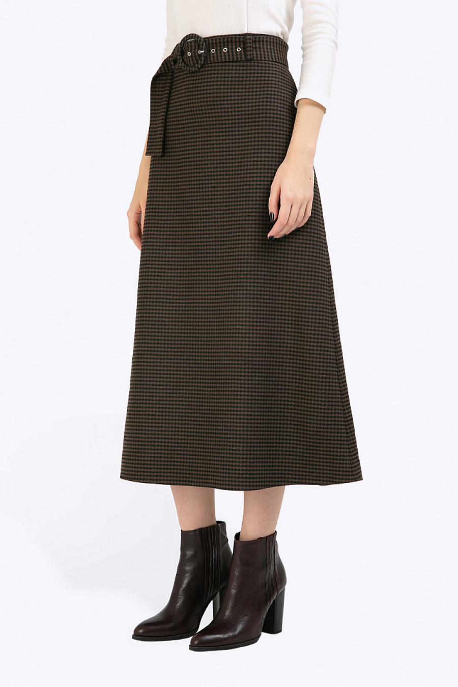 Коричневая юбка-миди в форме трапеции с орнаментом гусиная лапка. Модель имеетзастёжку-молнию в боковом шве.Основной акцент делается на подчёркивающий линию талии широкий пояс с крупной,обтянутой тканью пряжкой круглой формы. Юбка на подкладке. Рост фотомодели 176см.