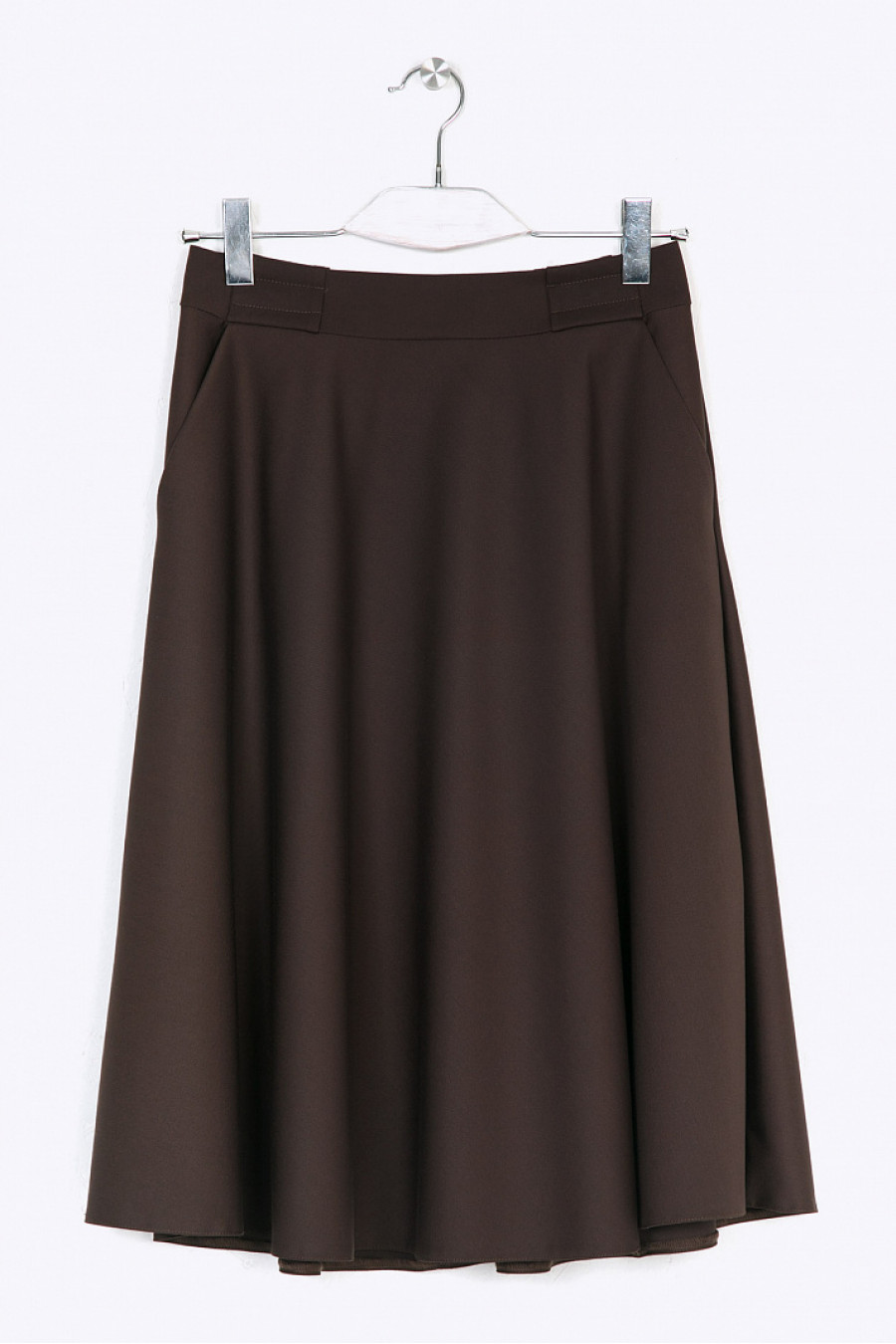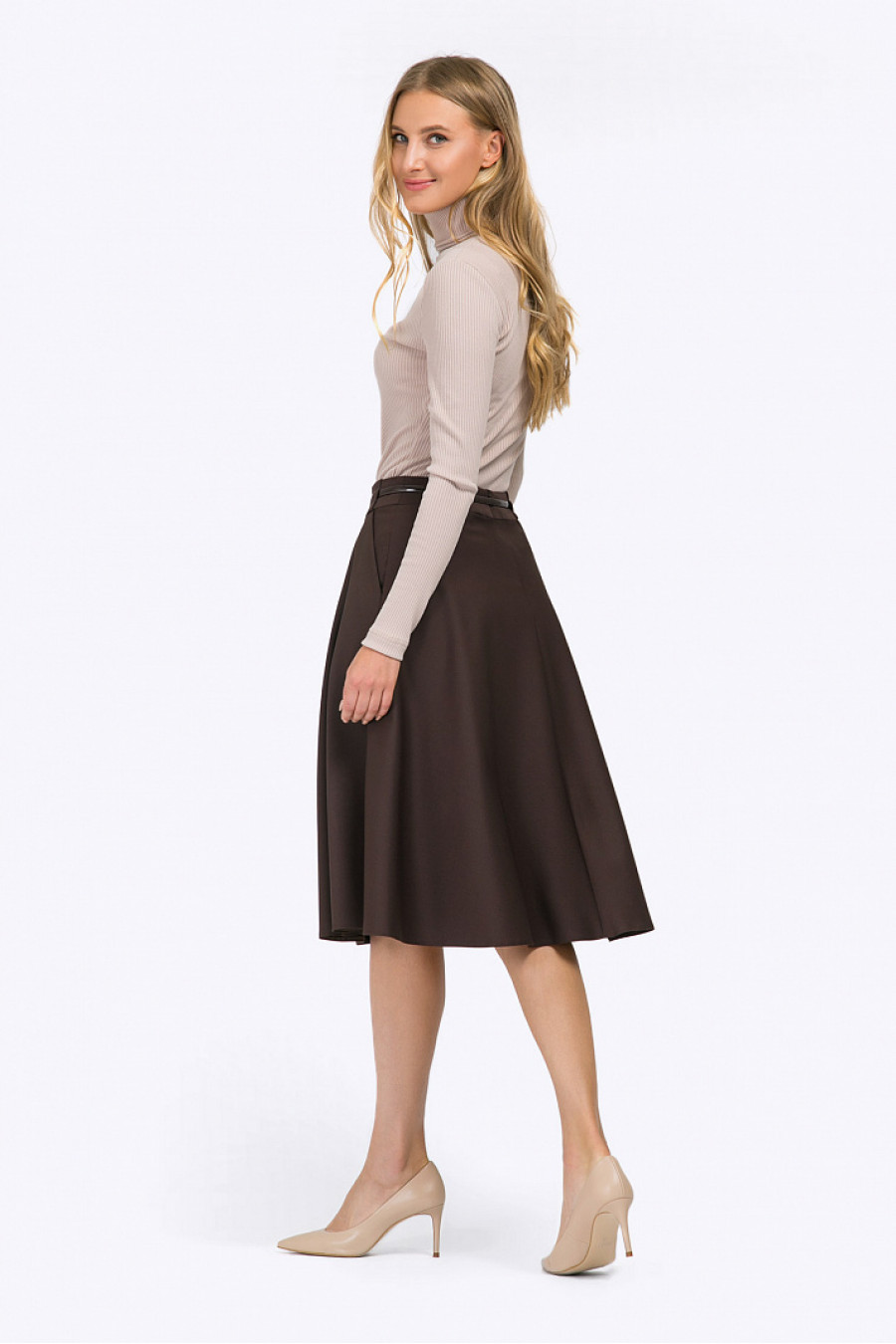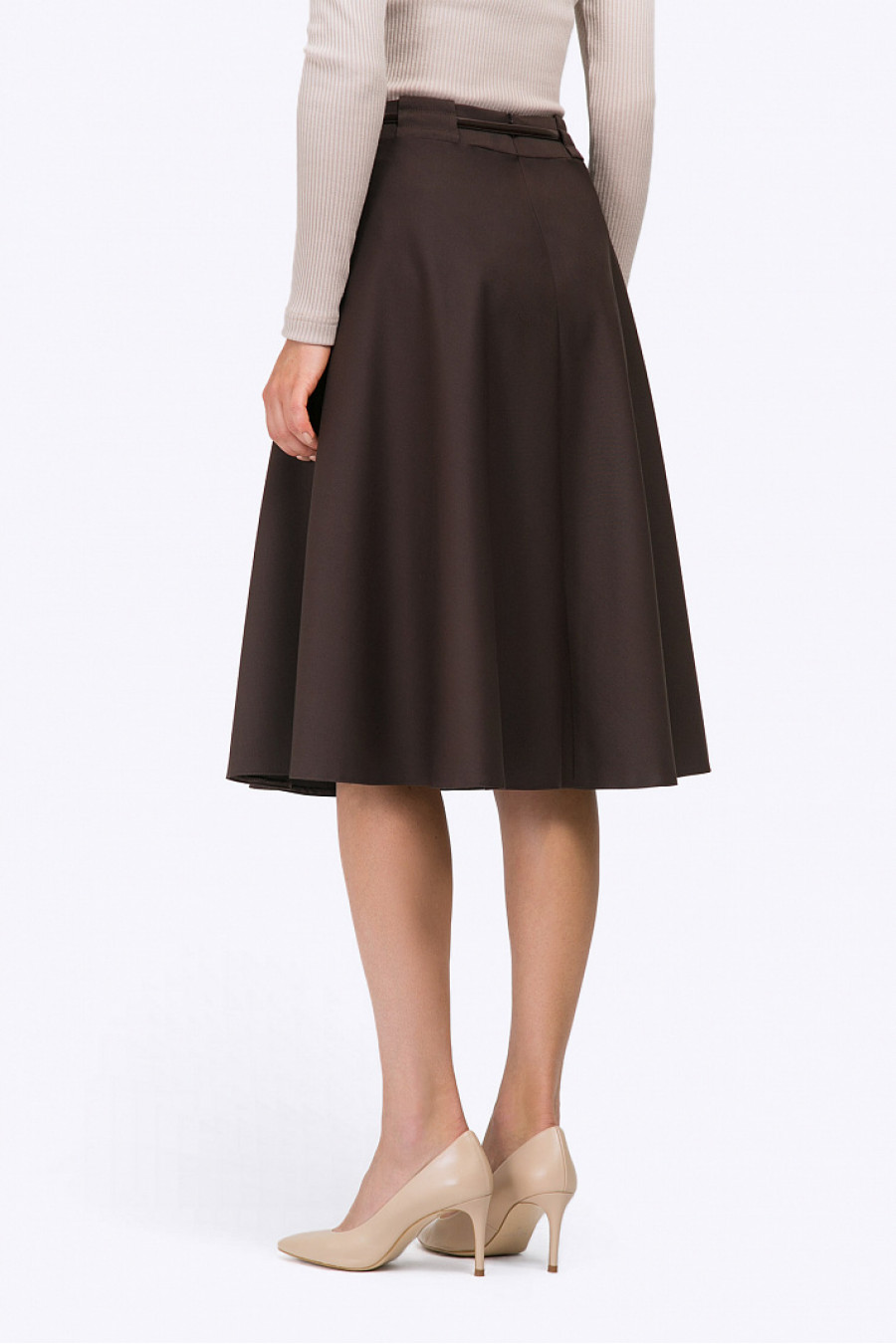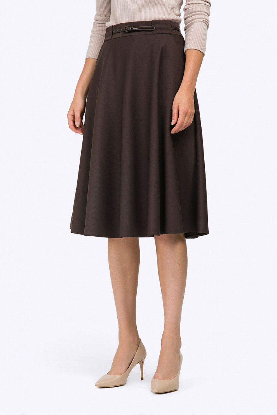 Коричневая юбка полусолнце для создания городских и деловыхобразов. Модель средней длины, пояс декорирован широкими шлёвками, линия талии