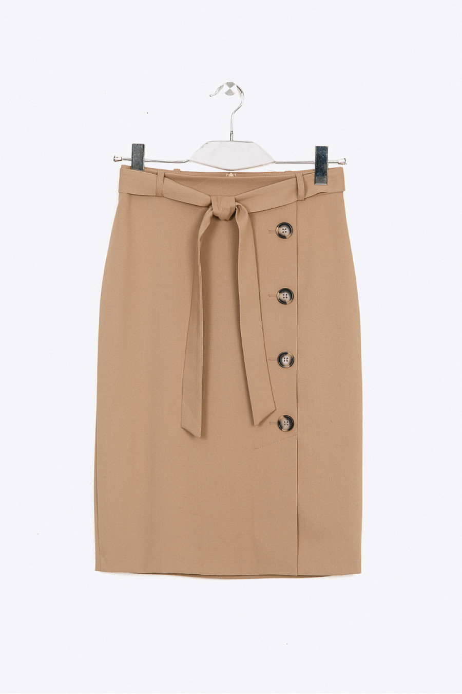 Юбка бежевого цвета на подкладке.Модель прямого кроя, с имитацией запаха, подчёркнутого рядом крупных пуговиц.Имеет на спинке застёжку «молнию». Дополнением служит длинный пояс. Рост фотомодели 177 см.