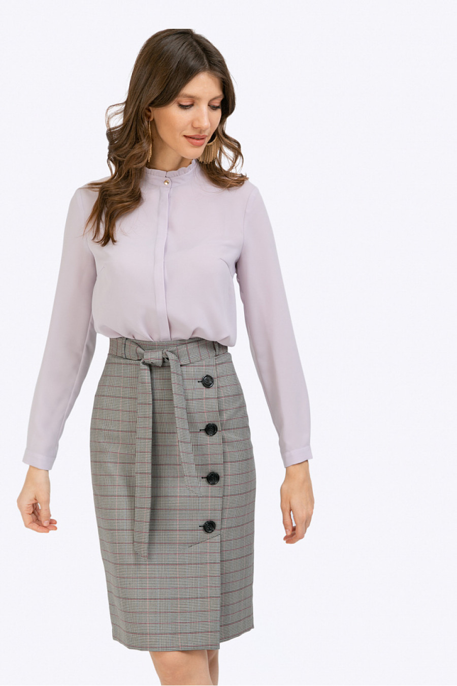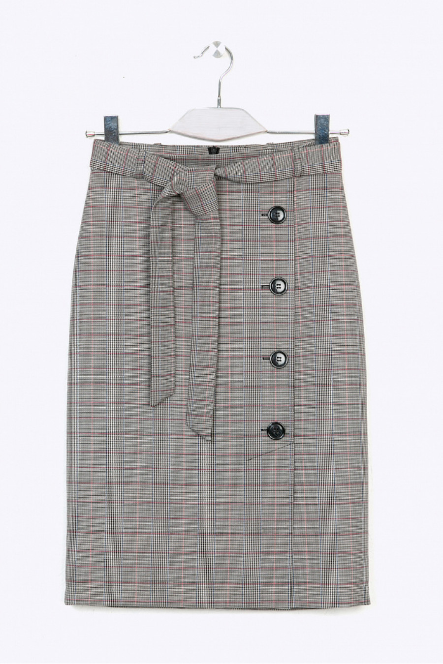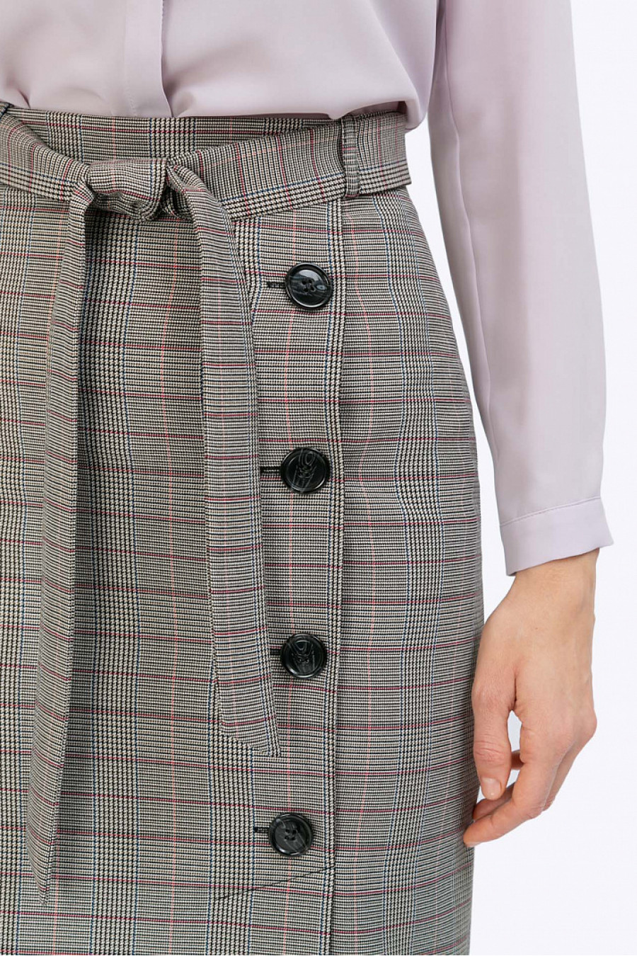 Юбка в разноцветную клетку на подкладке.Модель прямого кроя, с имитацией запаха, подчёркнутого рядом крупных пуговиц.Имеет на спинке застёжку «молнию». Дополнением служит длинный пояс. Рост фотомодели 177 см.