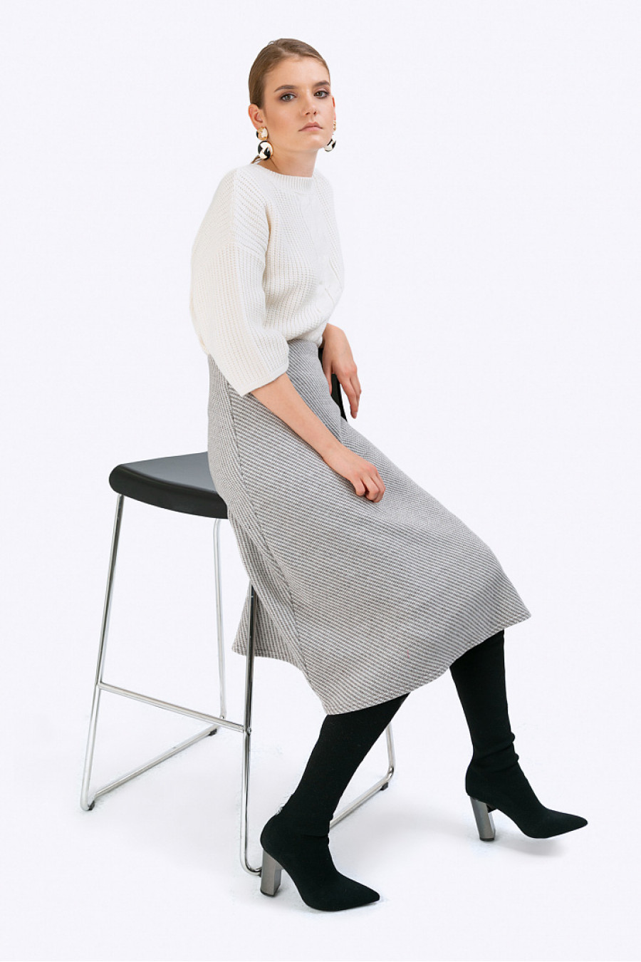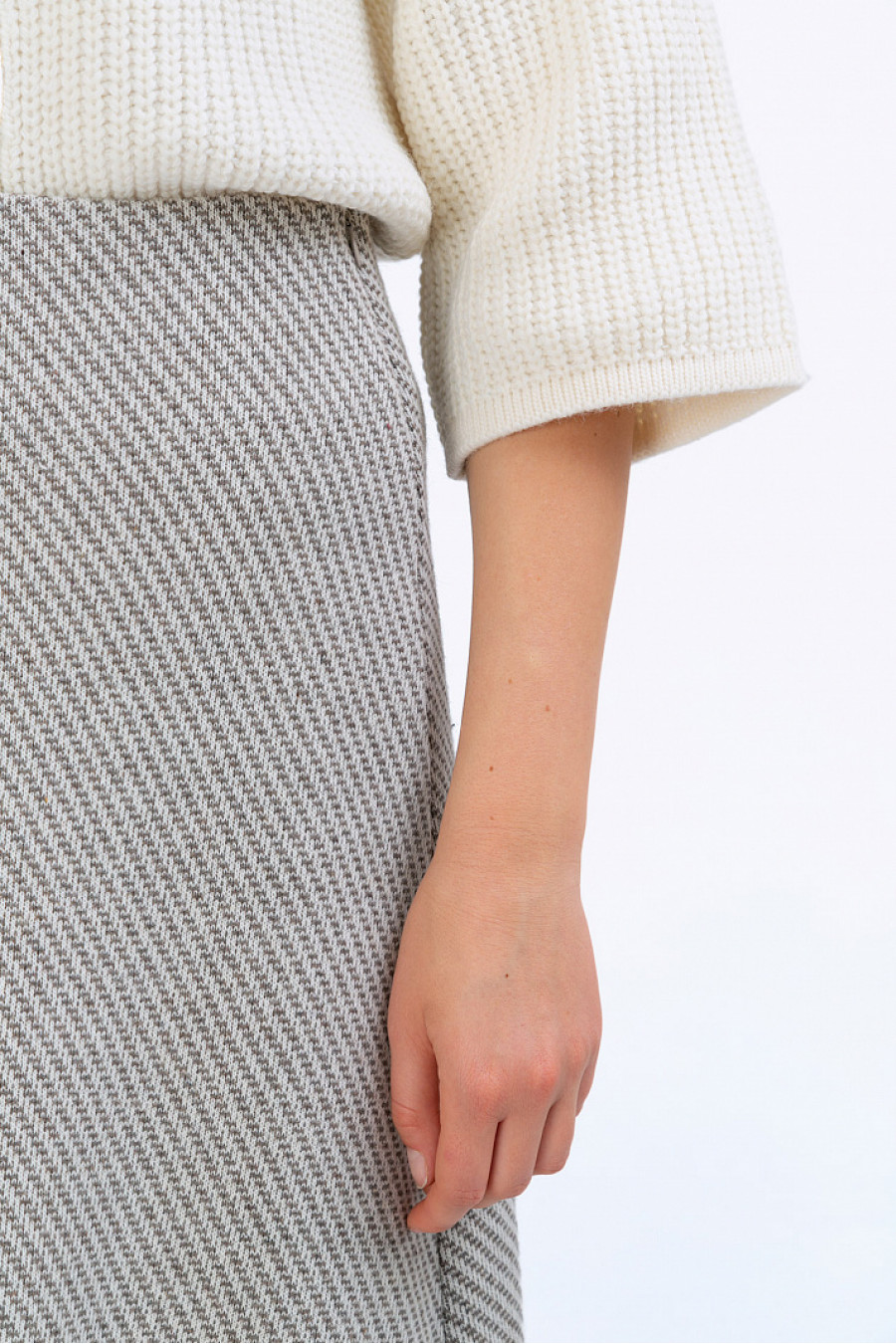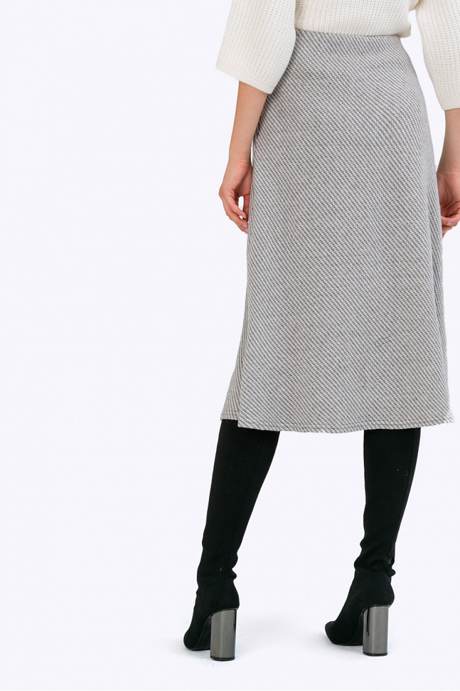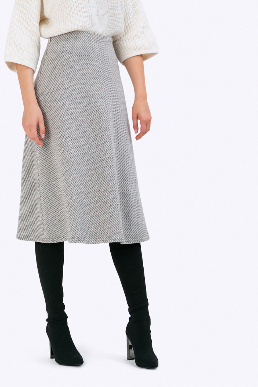 Юбка-миди из полушерстимолочного цвета в диагональный узор. МодельА-силуэта на подкладке.Застёжка молниярасположена в боковомшве.Модель хорошо сидит ине стесняет движения при ходьбе. Образ на фото дополненB2437/esse. Рост фотомодели 177 см.