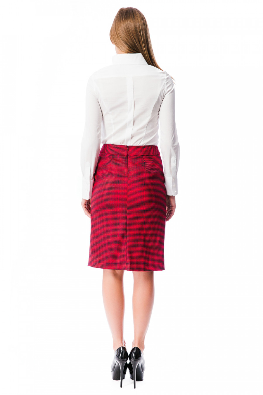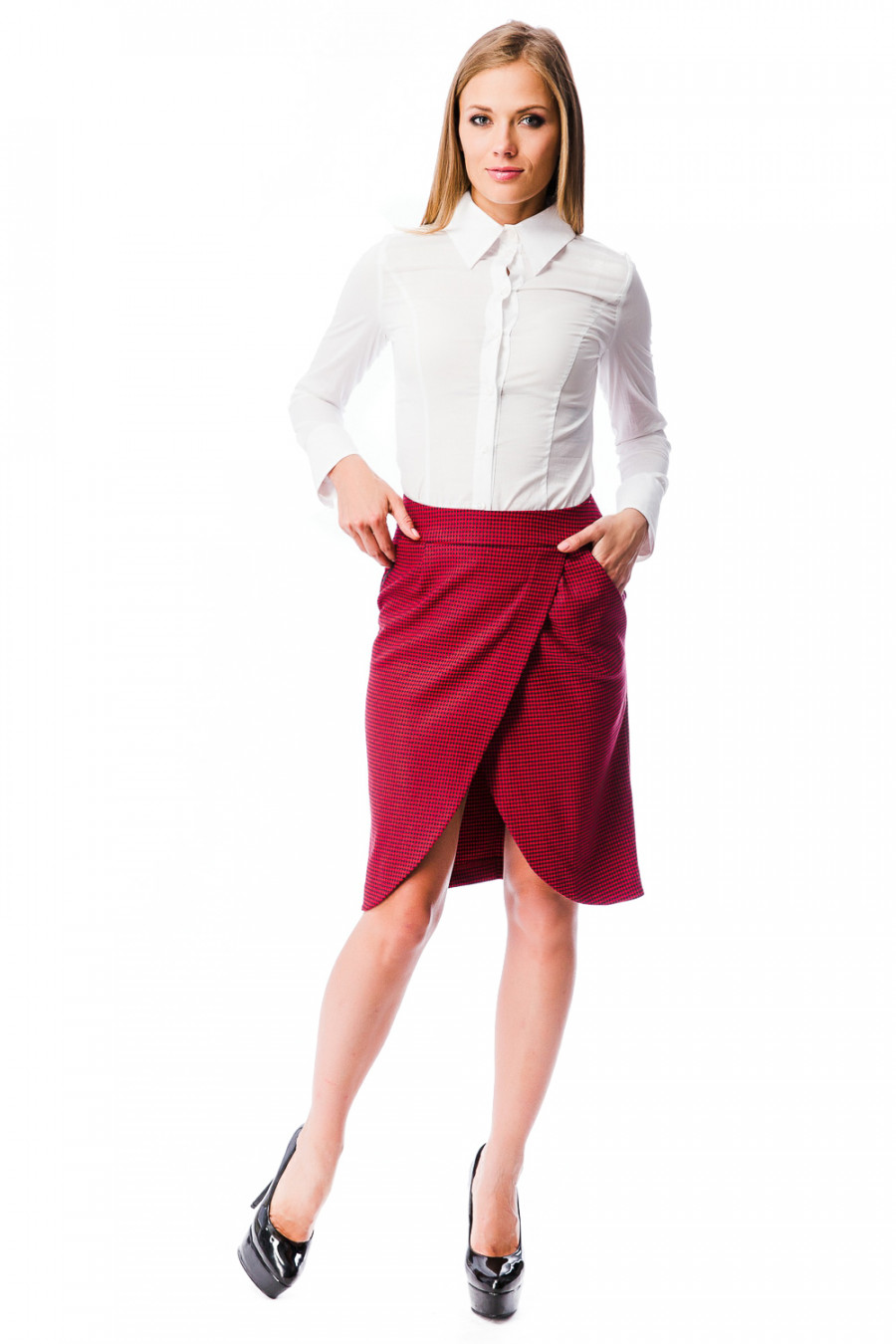 Модная юбка оригинального дизайна. Модель выполнена из качественной ткани и украшена стильным принтом "гусиная лапка". Юбка длиной до колена, передняя часть идет в нахлест с округленными краями. В боковых швах имеются скрытые карманы. Застежка-сзади на молнию. Стильная юбка неприменно украсит Ваш гардероб.
