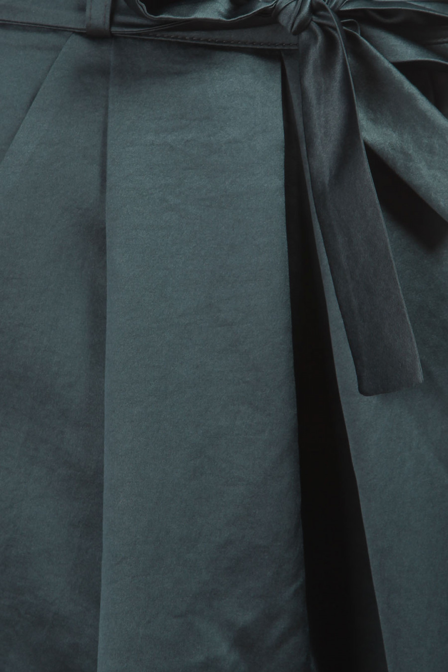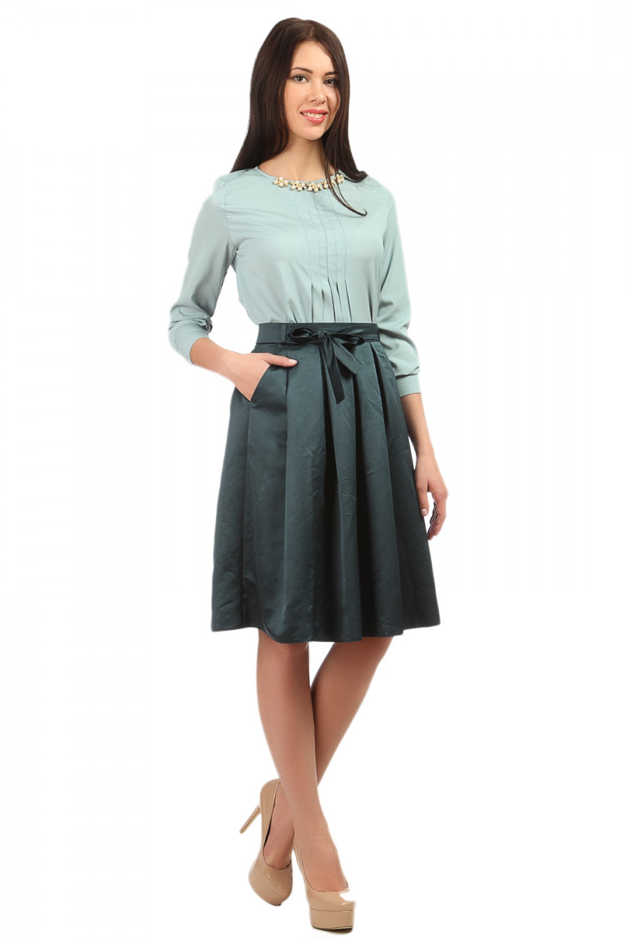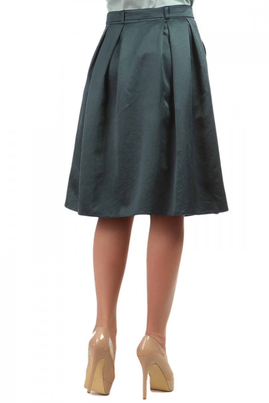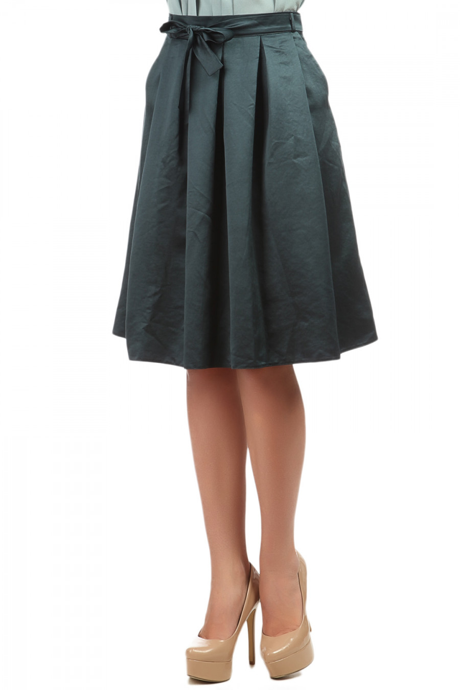 Юбка в складку средней длины с двумя рабочими карманами. Талия фиксируется поясом из такой же ткани, как и юбка.