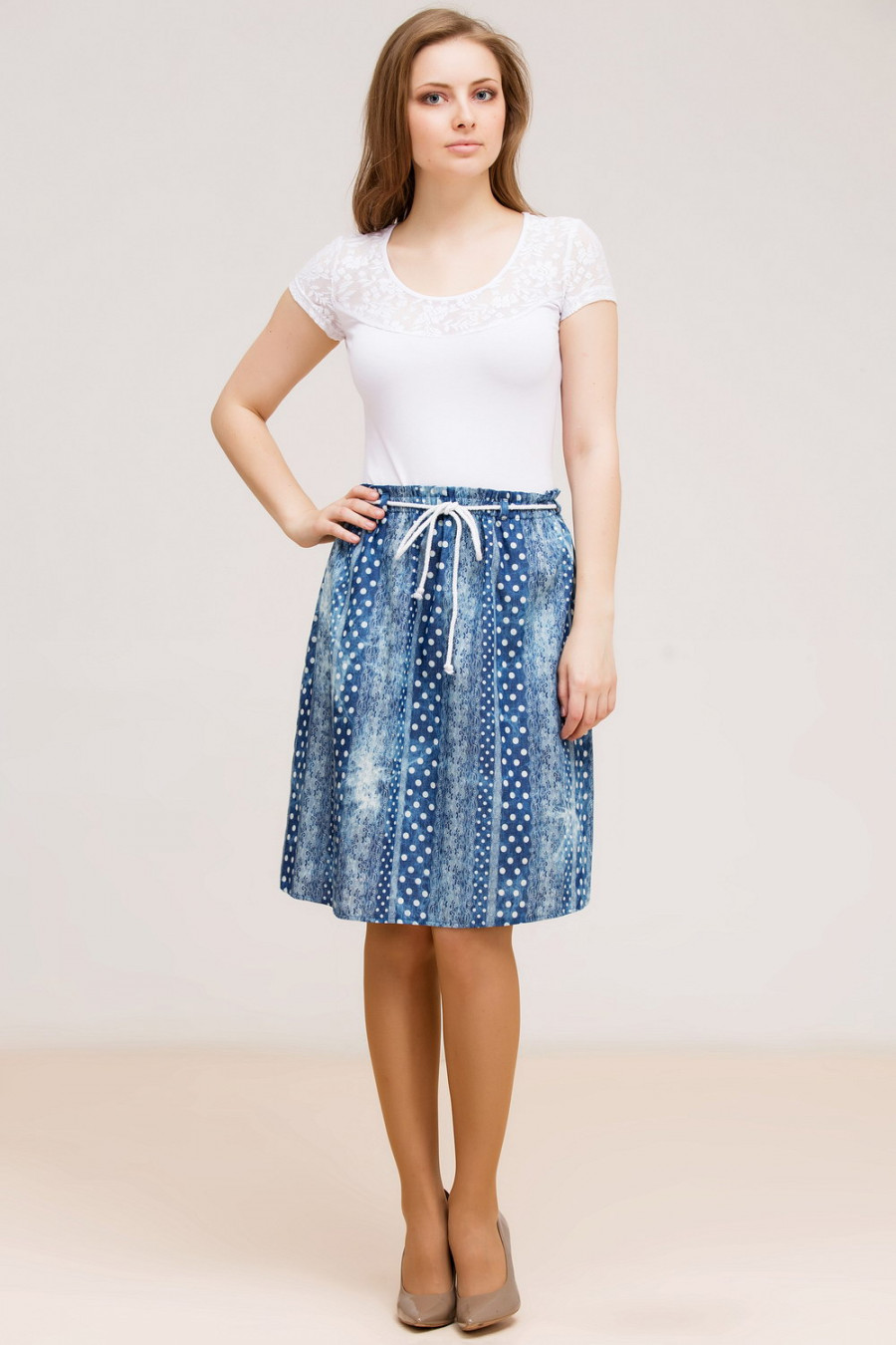 Юбка прямого покроя. Изделие длины миди со шлевками для ремня. Украшена рисунком в горошек и рисунком ""кружево"". В комплекте пояс-шнурок.
