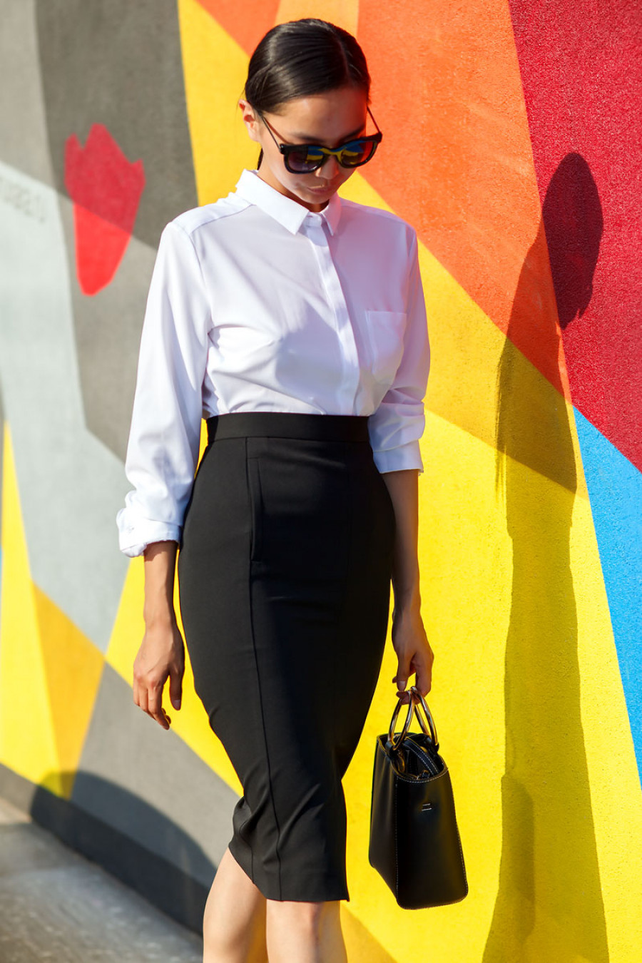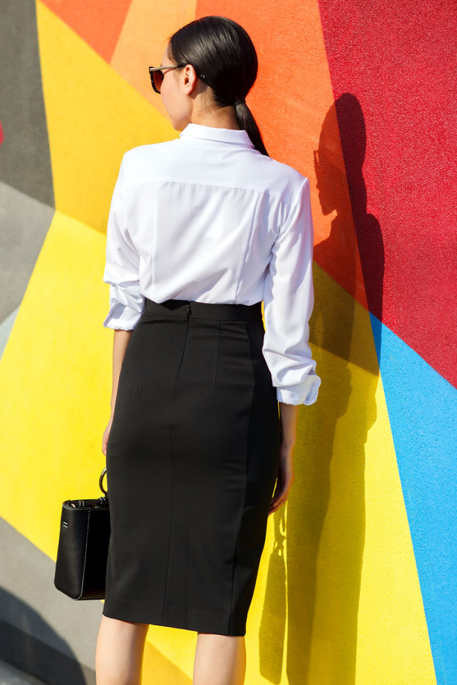 Стильная юбка-карандаш из ткани костюмной группы. Модель на поясе с разрезом впереди и имитацией карманов. Сзади застежка на потайную молнию.
