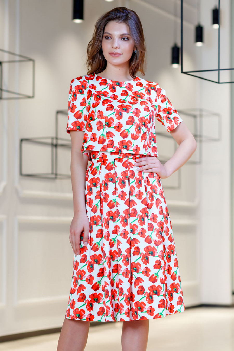 Яркая юбка миди из хлопка с цветочным принтом. Модель в складку на поясе. В боковых швах выполнены карманы. Сзади застежка на потайную молнию.