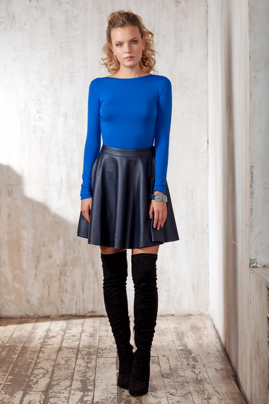 Стильная и эффектная кожаная мини-юбка. Модель силуэта клеш на подкладке. Сзади застежка-молния.
