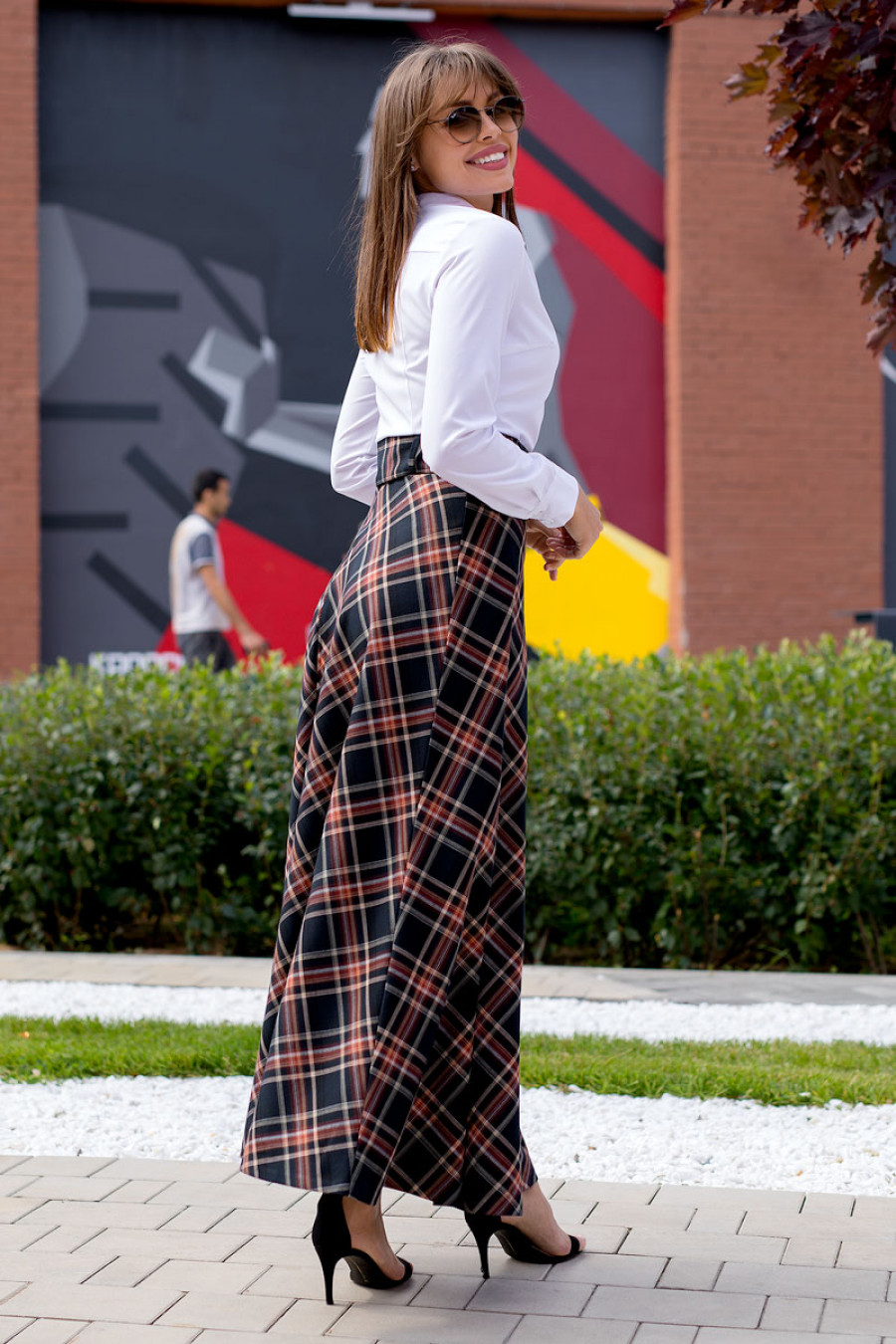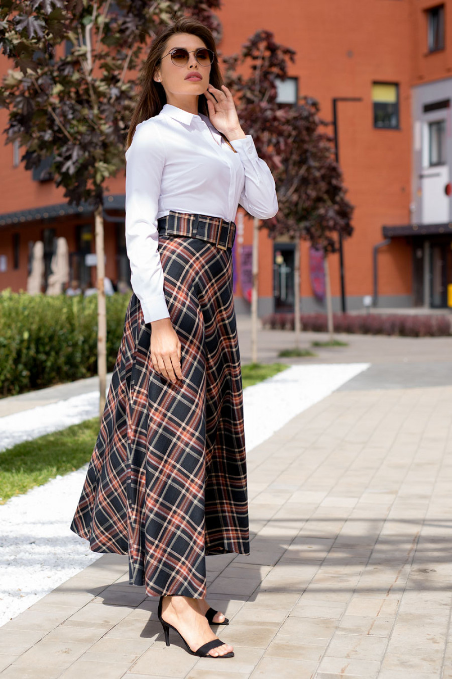 Женственная юбка макси из ткани костюмной группы с принтом в клетку. Модель приталенного силуэта с широким навесным поясом с пряжкой. Сзади застежка на потайную молнию.