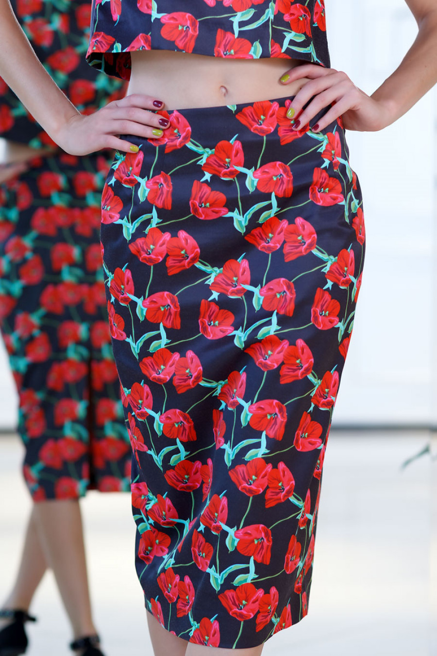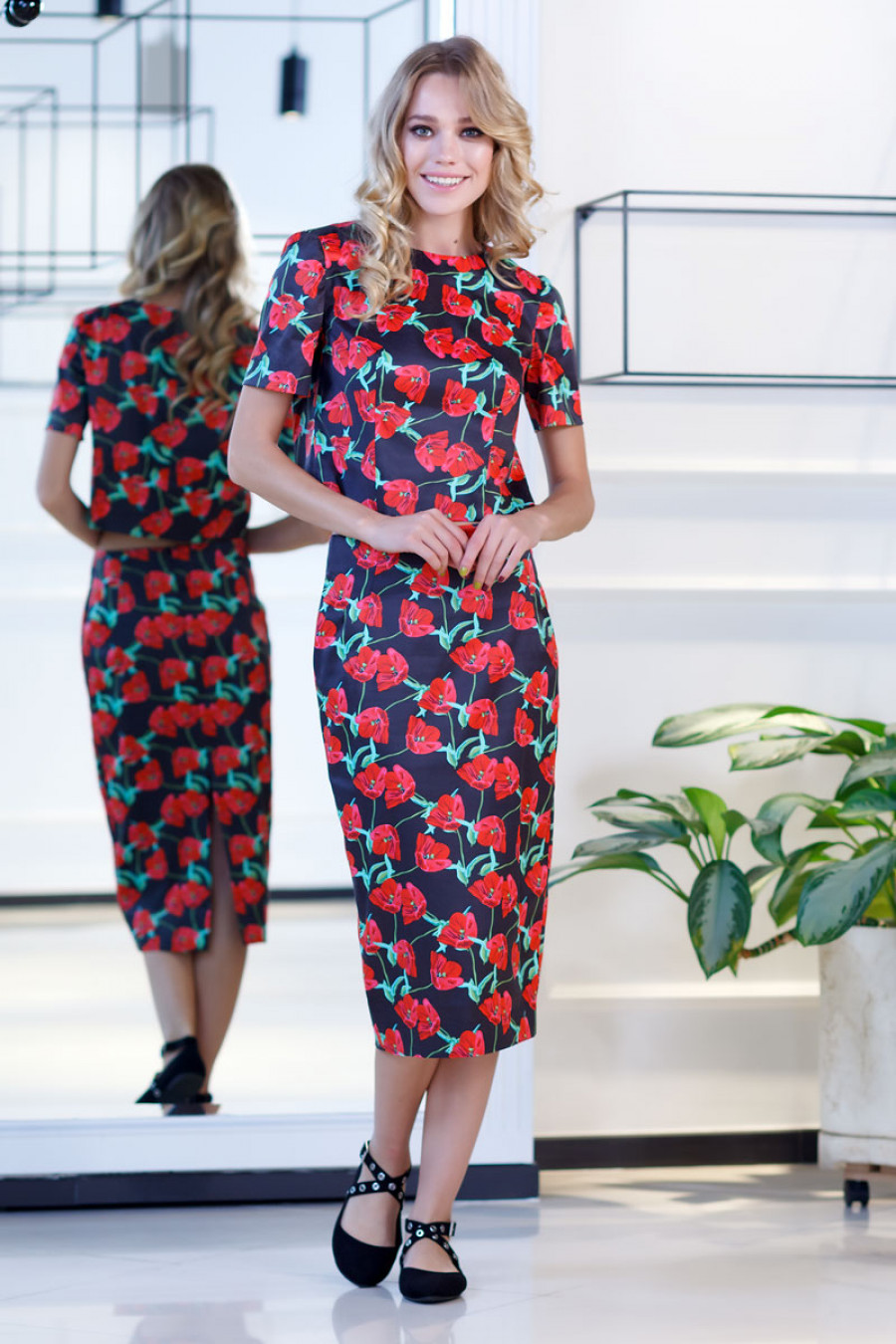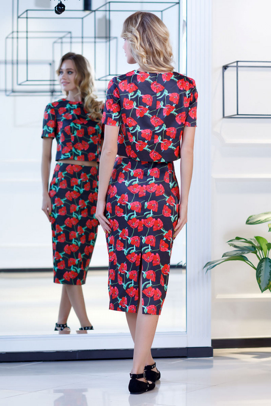 Элегантная юбка миди из хлопка с цветочным принтом. Модель прямого кроя с высоким разрезом сзади. Юбка выполнена с двойными вытачками по переду и спинке с отделочными строчками. Сзади застежка на потайную молнию.