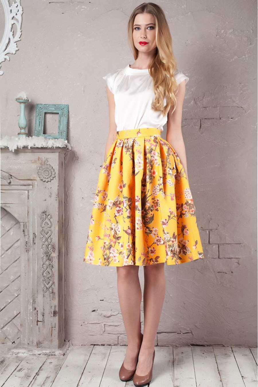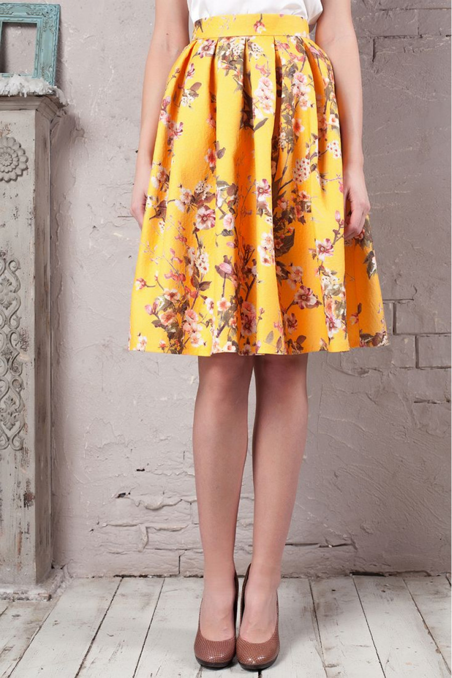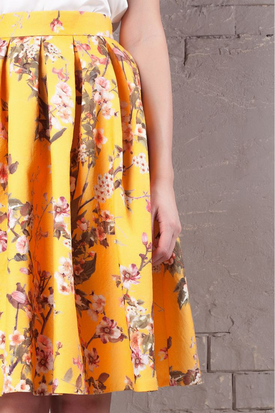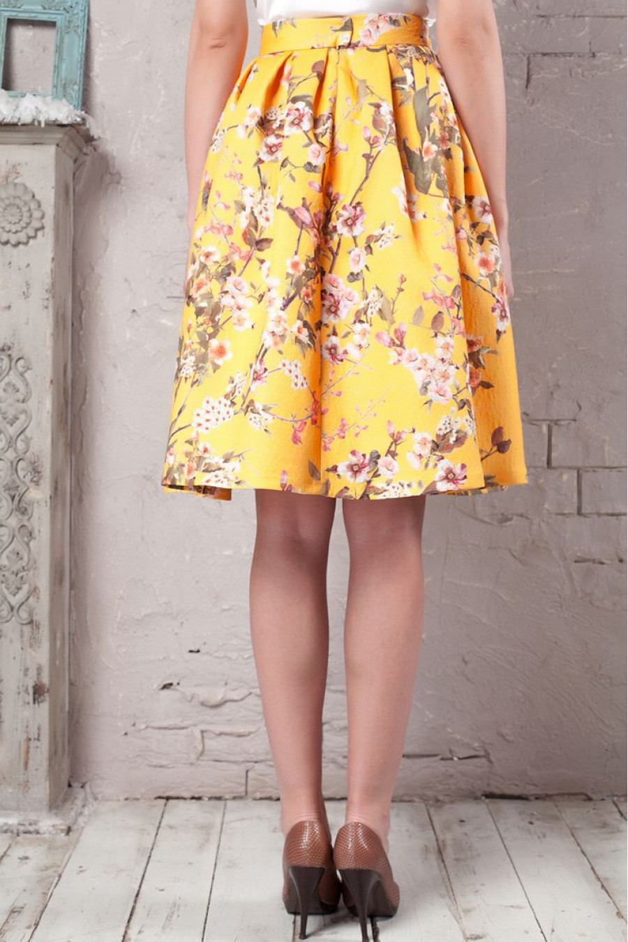 Юбка – клеш пополнит Ваш модный гардероб восхитительной свежей новинкой. Юбка с высокой талией. Вшитый узкий пояс. Ткань солнечного желтого цвета оформлена веточками с цветами. Длинна данной модели – выше колена. В юбке от Stella Di Mare любой день становиться настоящим праздником!