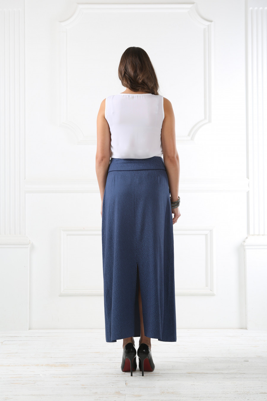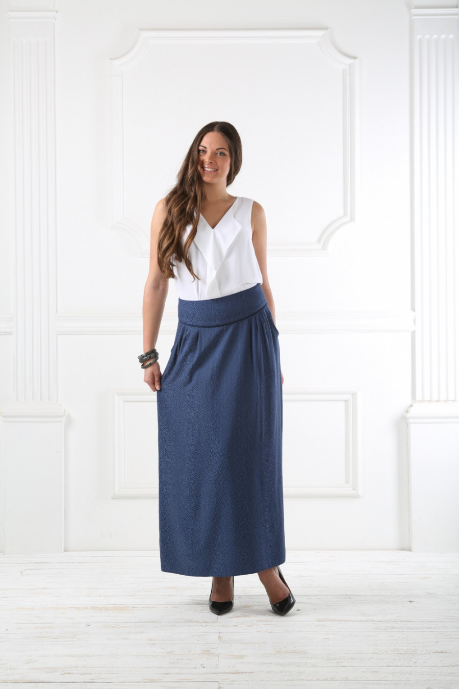 Юбка синяя на средней посадке, длинная на кокетке - «Жаккард-горошки»