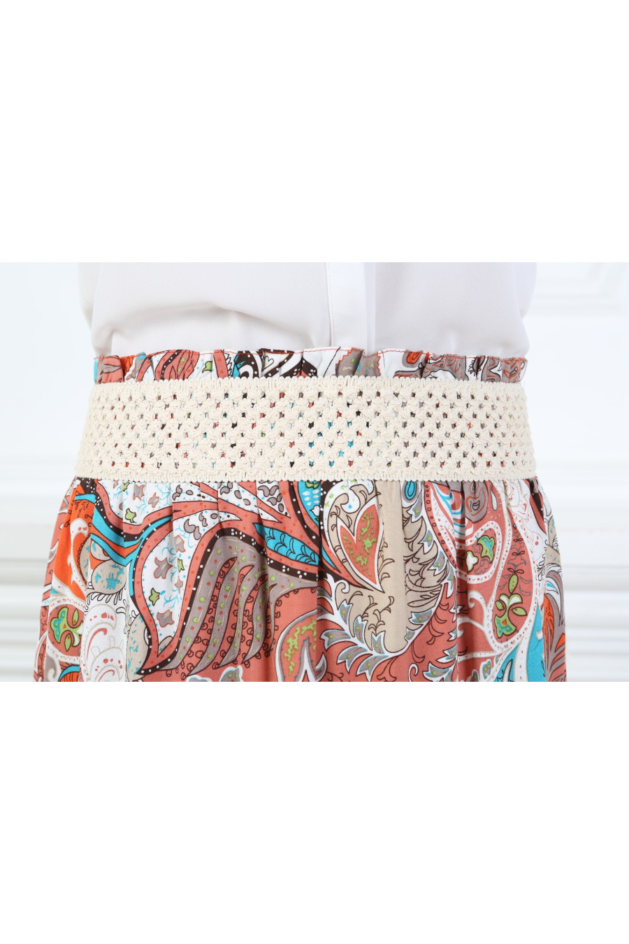 Юбка на средней посадке длинная на резинке, прямая, с абстрактным рисунком «Штапель» «Павлин» оранжево-белая
