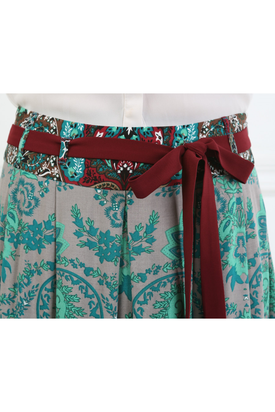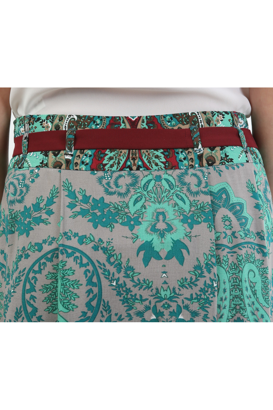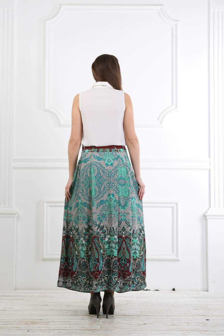 Юбка зеленая на средней посадке расклешенная, с защипами, длинная, с поясом - «Купон-цветы»
