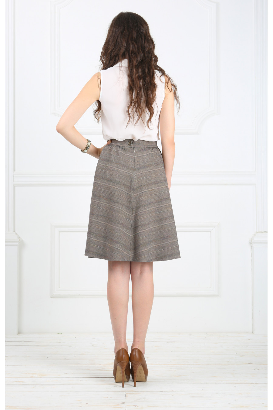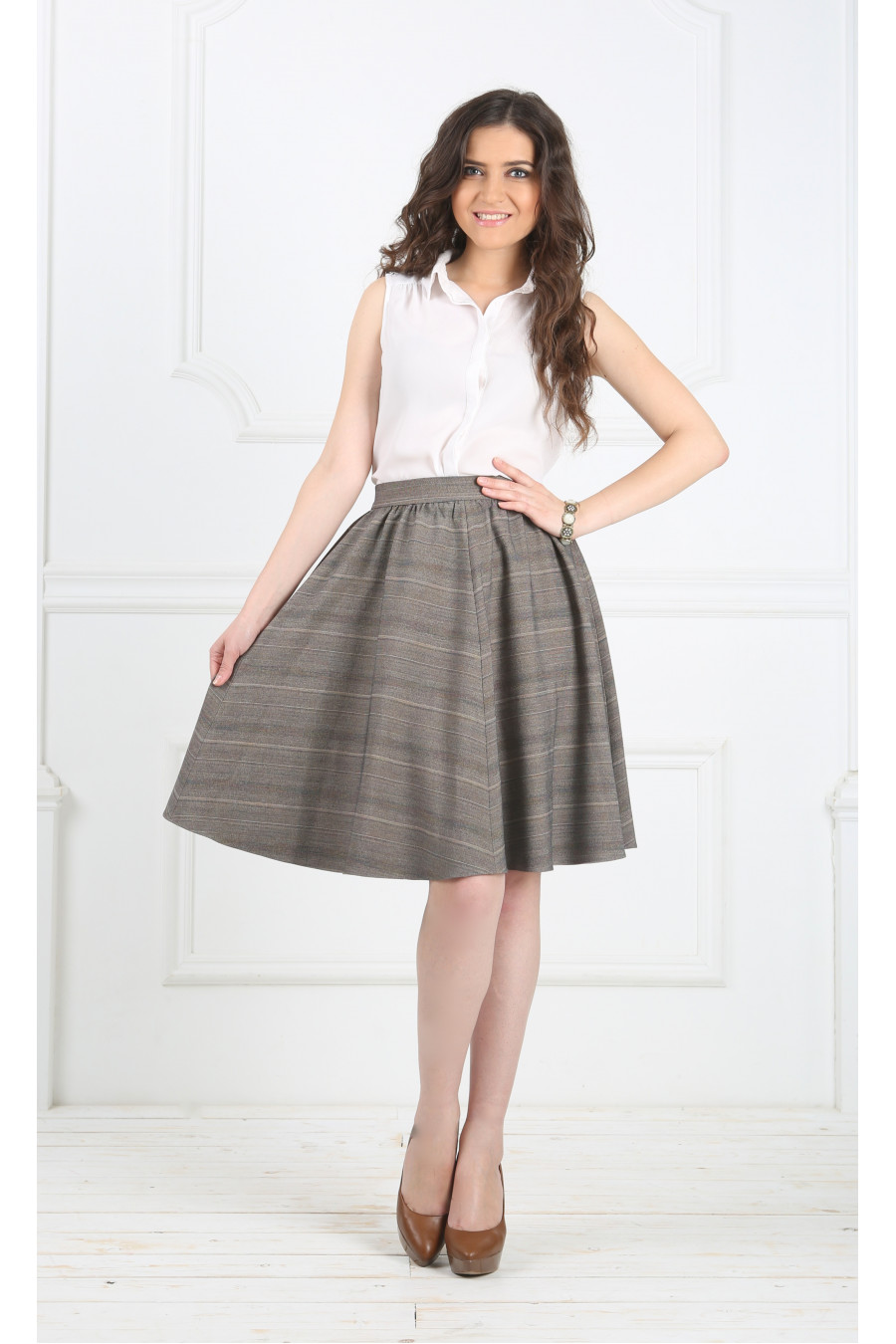 Юбка на высокой посадке на сборке с отделкой «Дарина» бежево-коричневая