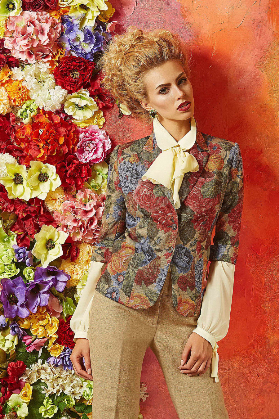 Изысканный жакет прилегающего силуэта, выполнен из купонной итальянской ткани демонстрирует безупречный крой и посадку. Английский воротник, застежка на две пуговицы. По спинке шлица для комфортного движения. На рукавах располагаются манжеты. Изделие на подкладке. (Брюки артикул: M2141В3001, Блуза артикул M2141T5001).