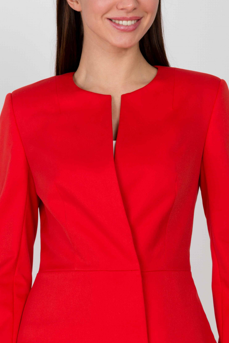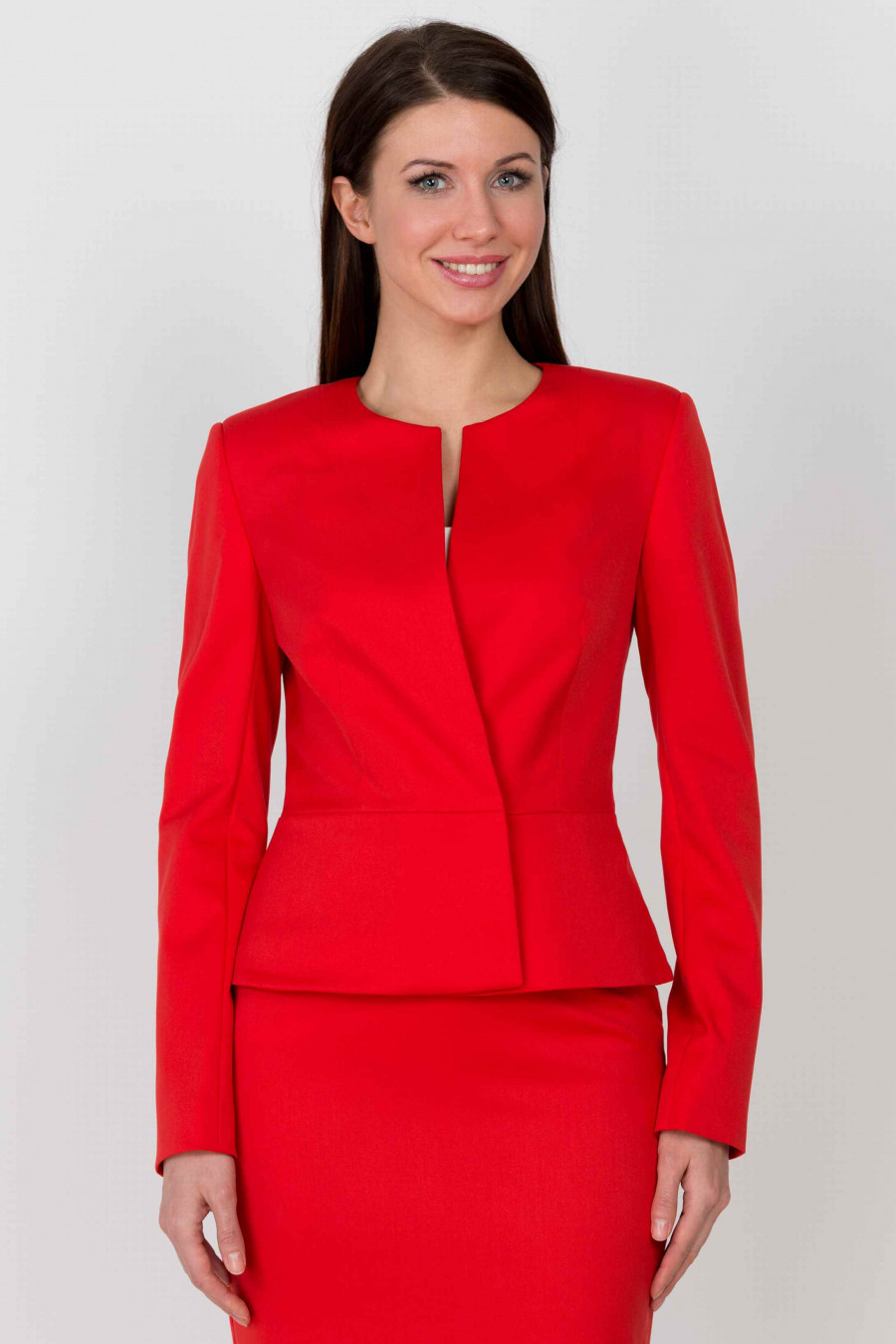 Жакет в деловом стиле, идеально подчеркивает линию талии. Сделан из ткани средней плотности, гладкой, очень приятной на ощупь. Насыщенно-красного цвета. Застегивается на двух кнопках. Жакет отлично подойдет для деловых переговоров, встреч и важных рабочих презентаций.