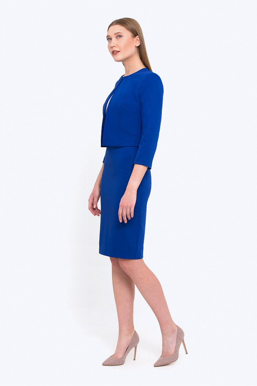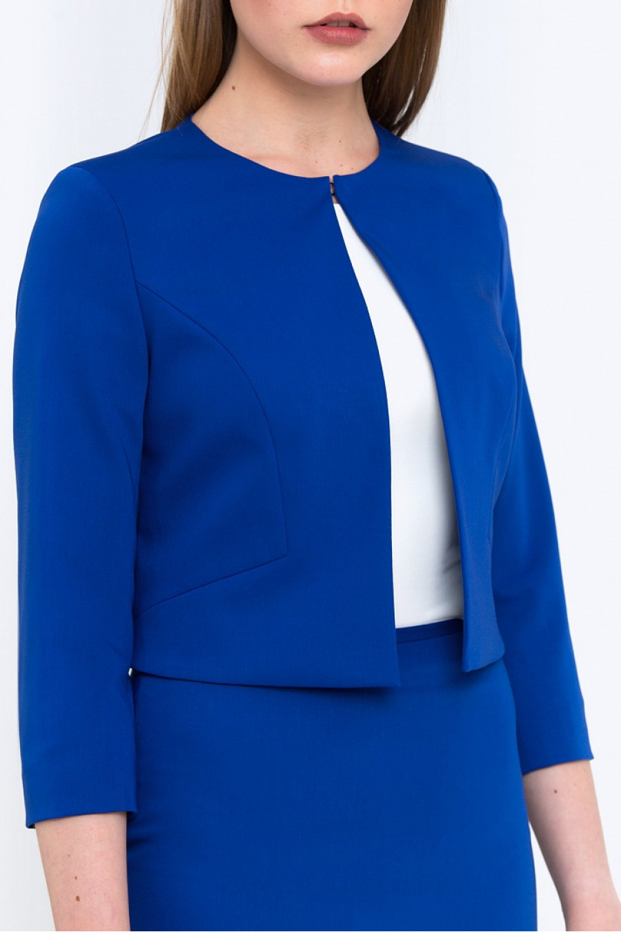 Элегантный укороченный жакет. Ткань мягкая, приятная на ощупь. Жакет застегивается на металлический крючок. Есть легкая подкладка из полиэстера. Жакет отлично смотрится с классической юбкой-карандаш, хорошо подойдет как для офиса, так и для торжественных деловых мероприятий.