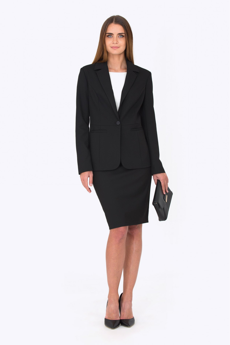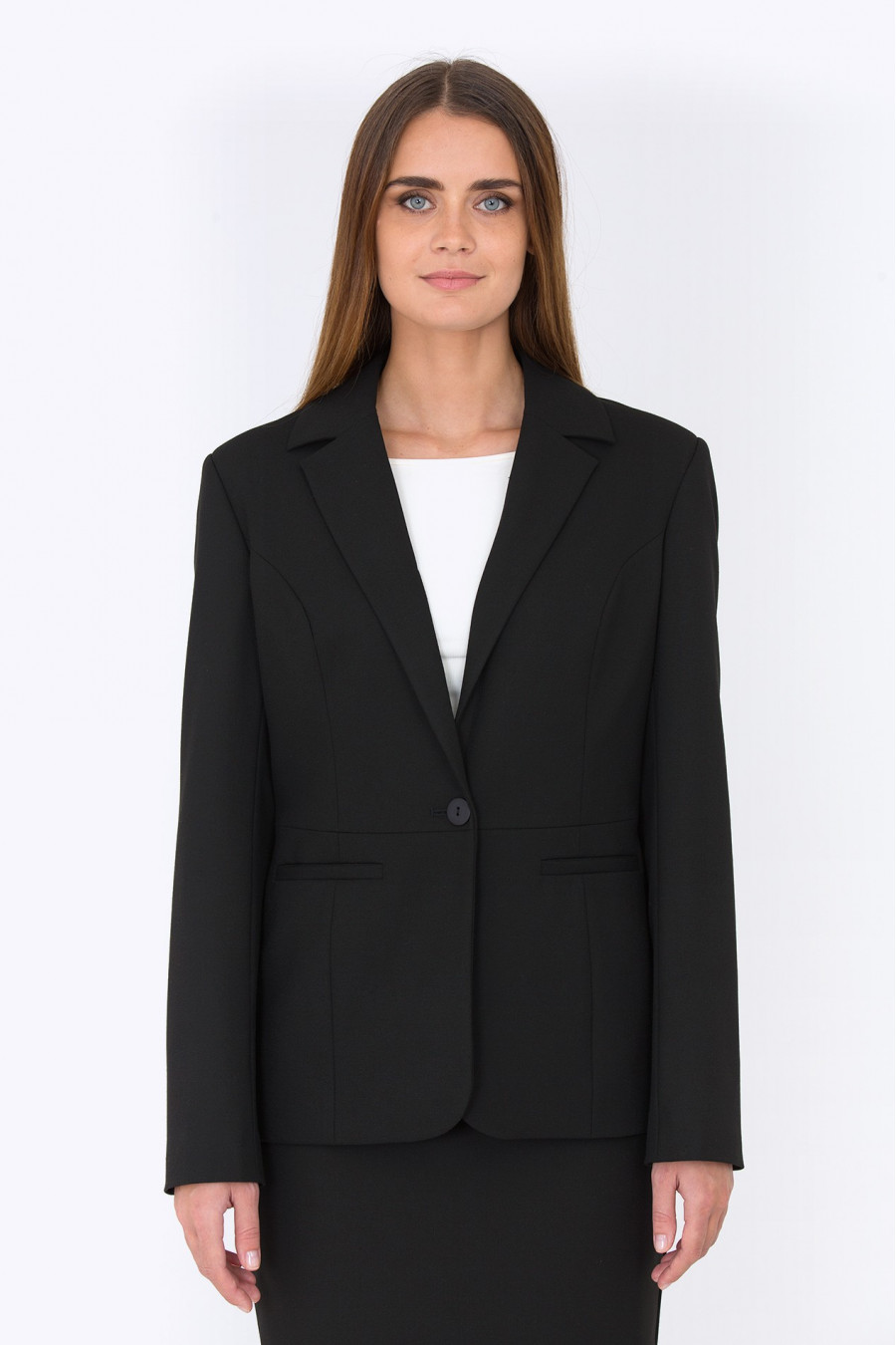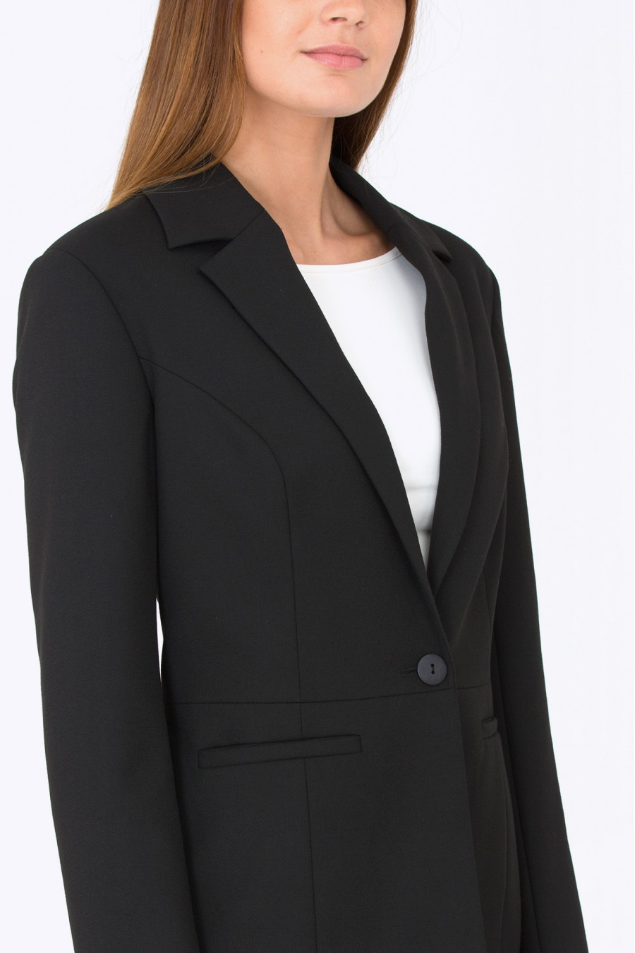Элегантный удлиненный жакет с лацканами. Ткань костюмная черного цвета. Рукава длинные, спереди - удобные функциональные кармашки. Застегивается на одну пуговицу, есть подкладка из полиэстера. Универсальная модель для осеннего сезона, хорошо сочетается как с классическими юбками, так и с брюками. Визуально вытягивает силуэт.