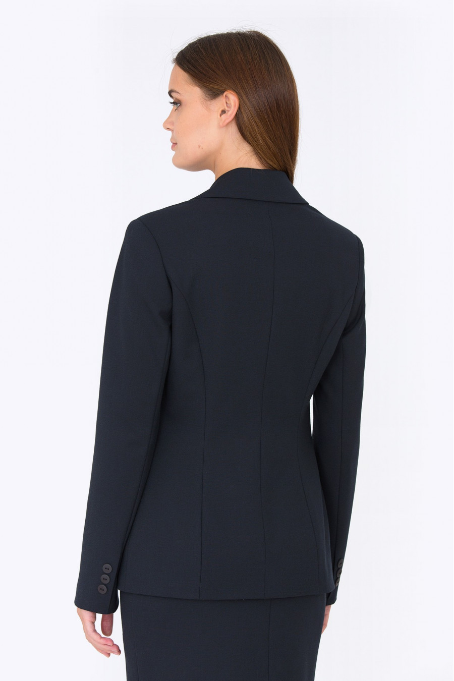 Элегантный удлиненный жакет с лацканами. Ткань костюмная иссиня-черного цвета. Рукава длинные, спереди - удобные функциональные кармашки. Застегивается на одну пуговицу, есть подкладка из полиэстера. Универсальная модель для осеннего сезона, хорошо сочетается как с классическими юбками, так и с брюками. Визуально вытягивает силуэт.