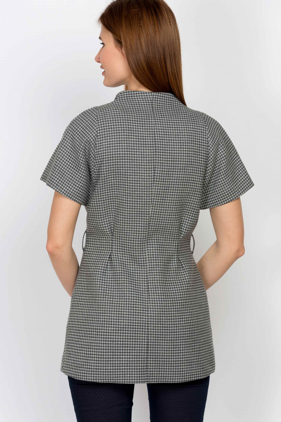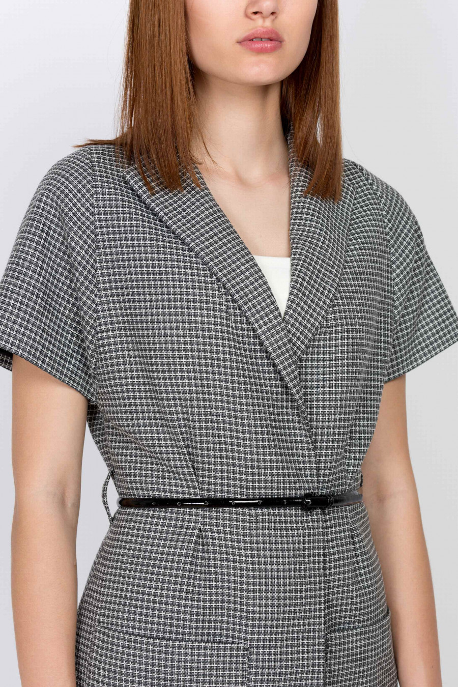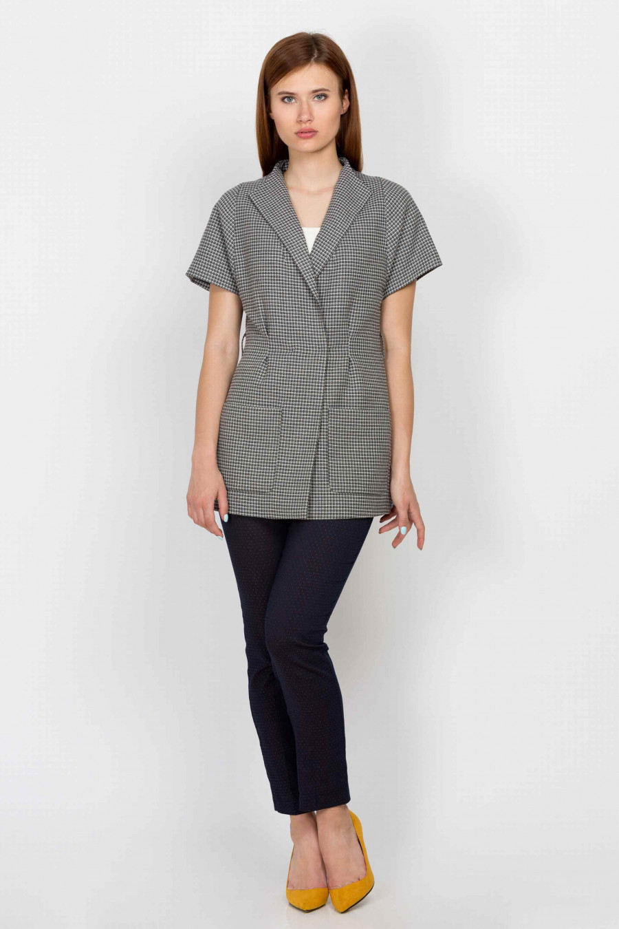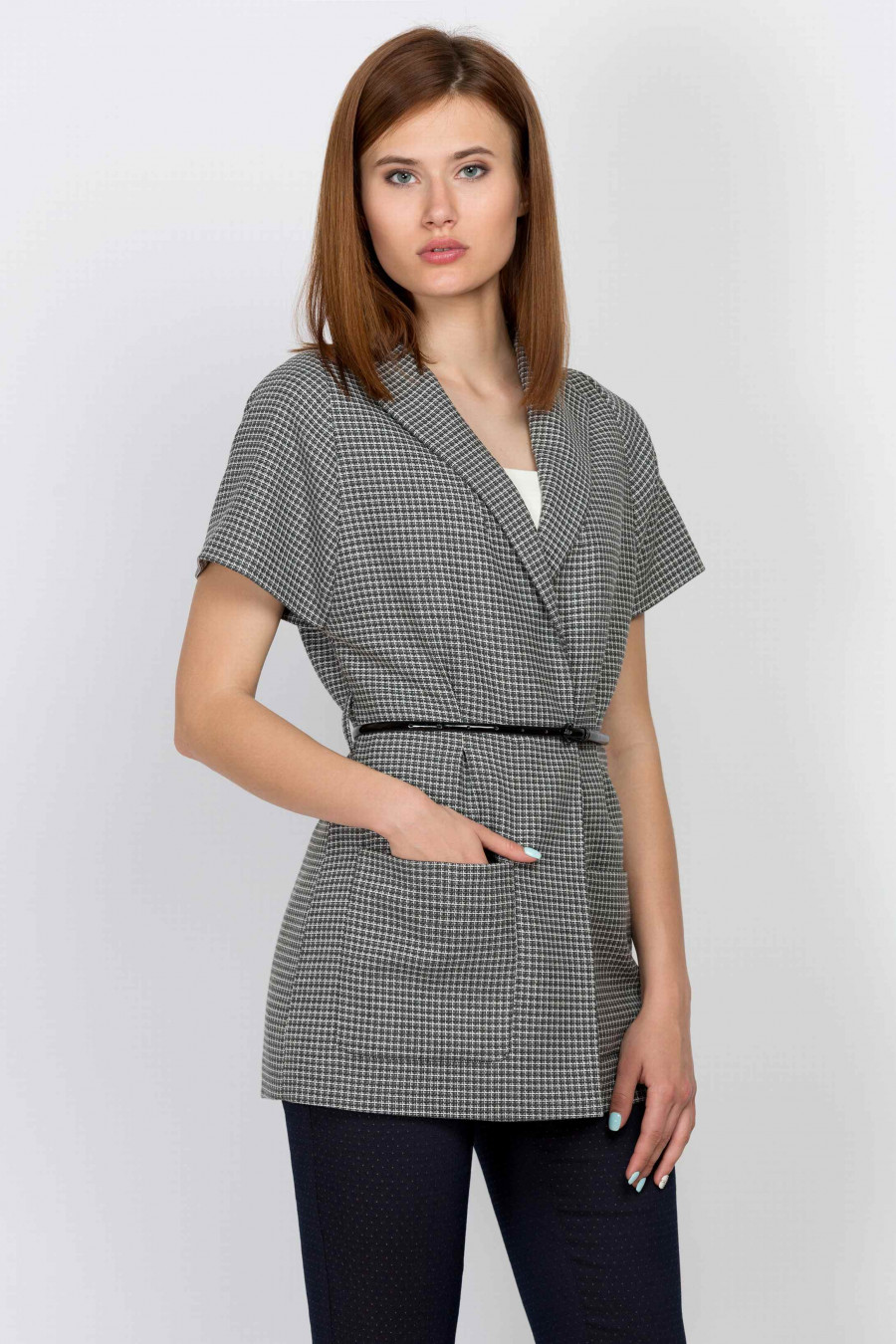 Приталенный жакет с лацканами. Ткань на основе вискозы мягкая, фактурная в серо-бежевую клетку. Рукава короткие, спереди есть накладные функциональные кармашки. Жакет застегивается на кнопки. Есть подкладка из полиэстера. На поясе шлевки, ремешок продается отдельно. Очень комфортная и удобная модель. Хорошо сочетается с брюками и джинсами. Подойдет для повседневной носки.