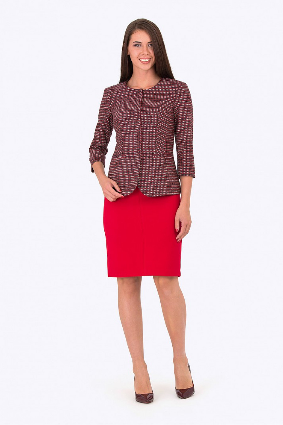 Приталенный жакет в мелкую клетку. Рукав 3/4. Спереди втачные карманы.
