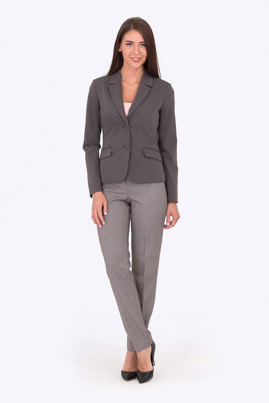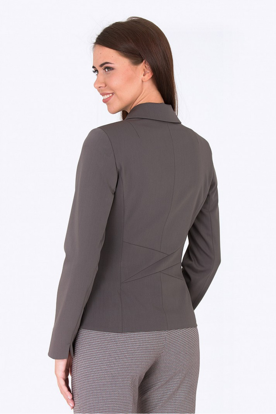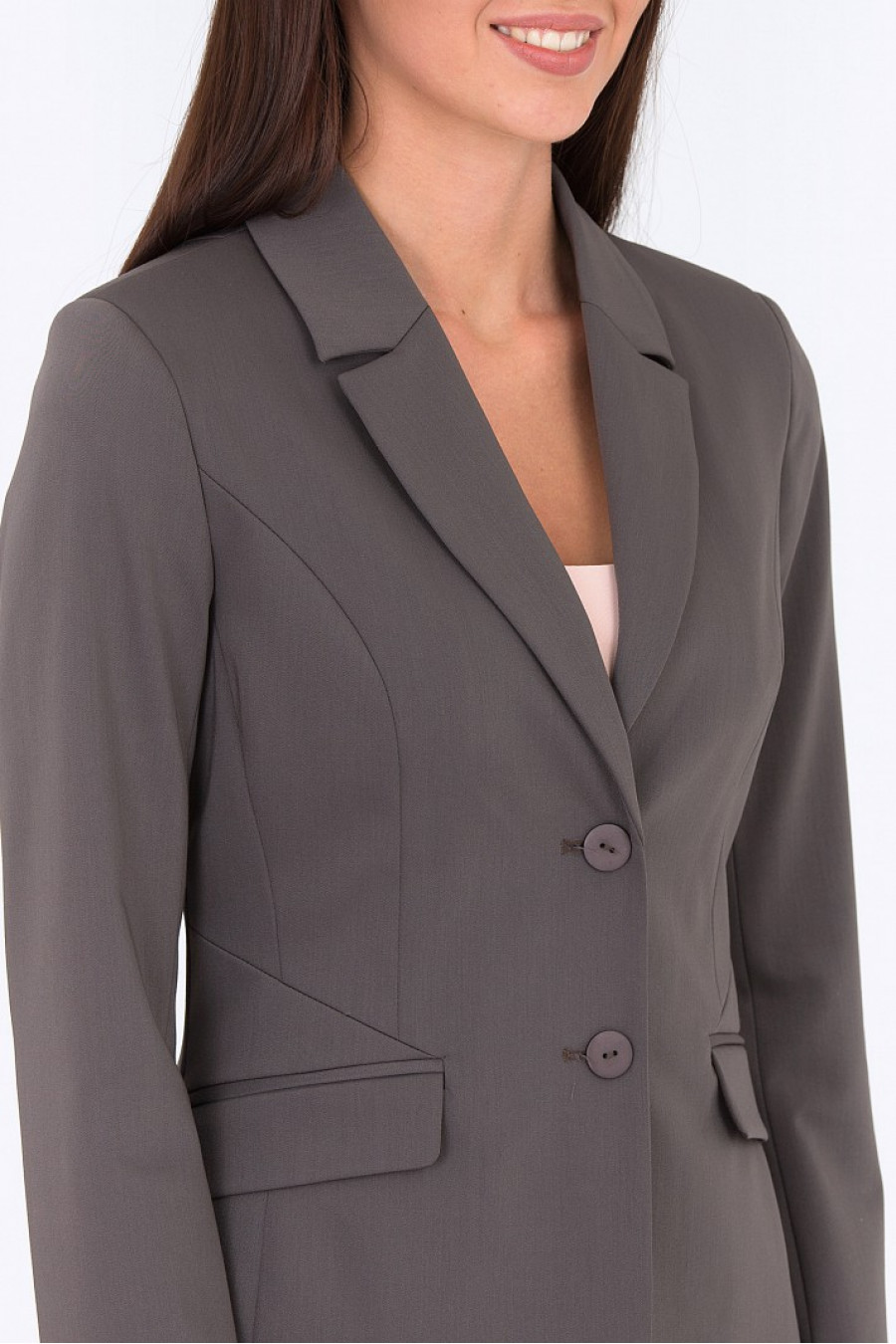 Элегантный жакет с лацканами. Ткань костюмная приятного цвета какао. Рукава длинные, спереди - удобные функциональные кармашки с клапанами.Застегивается на две пуговицы, естьподкладка из полиэстера. Универсальная модель для осеннего сезона, хорошо сочетается как с классическими юбками,так и с брюками. Визуально вытягивает силуэт, интересно смотрится благодаря оригинальным рельефам.