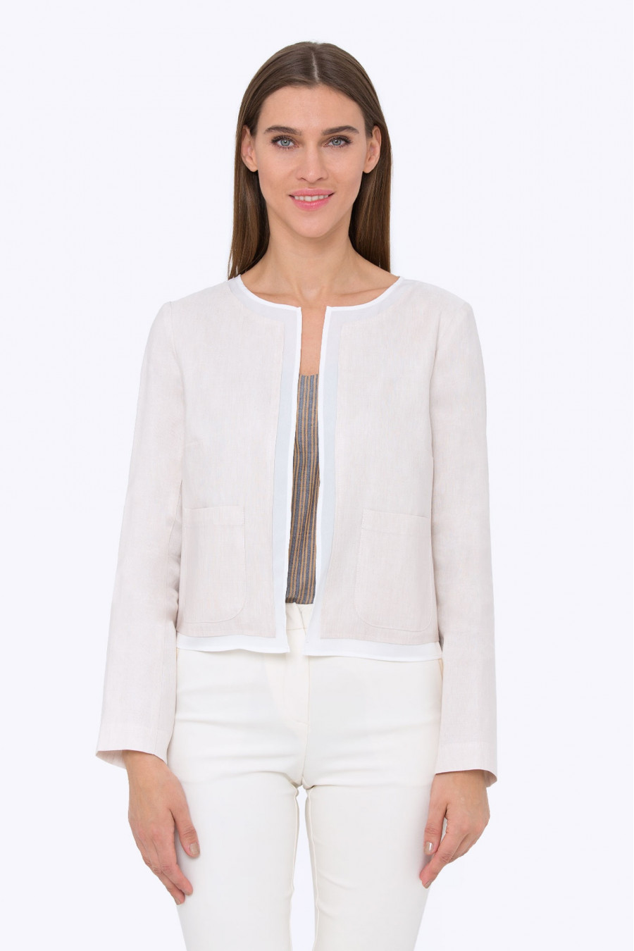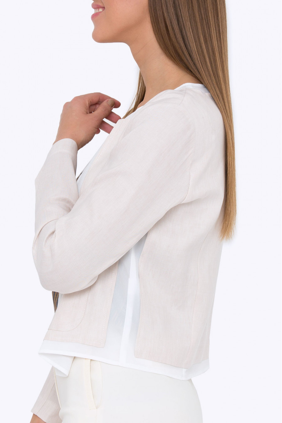 Жакет свободного кроя. Модель состоит из двух тканей, легкий шифон белого цвета и основная ткань пастельно-бежевого оттенка. По бокам накладные карманы. Стильный жакет подойдет для повседневной носки, а так же станет прекрасным дополнением вечернего образа. Рост фотомодели 178 см.