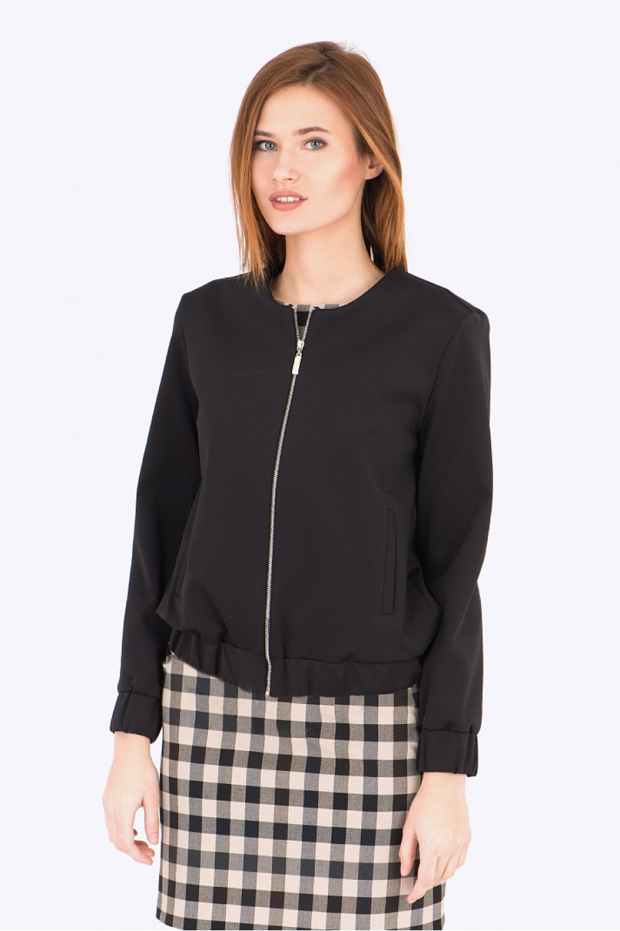 Куртка-бомбер черного цвета. Ткань плотная эластичная. Застежка на молнию, без подкладки. Универсальная модель, дополнит любой образ и сделает его модным и стильным.