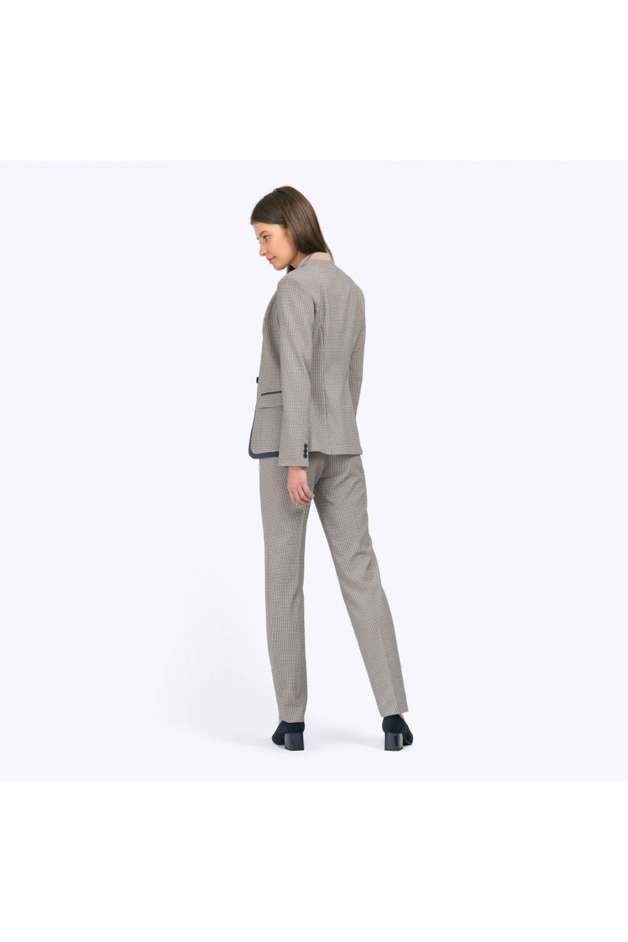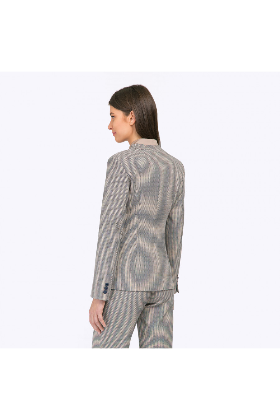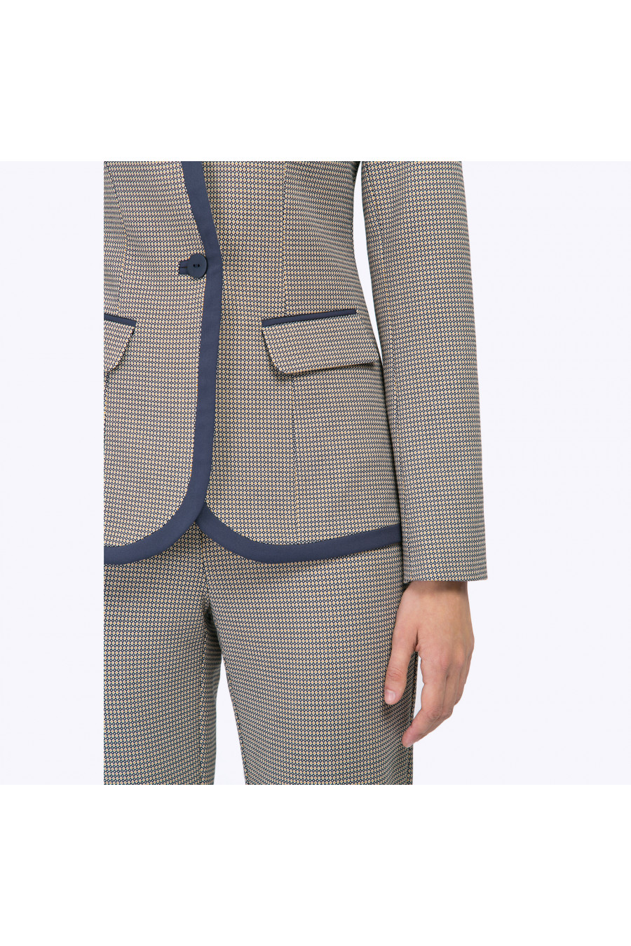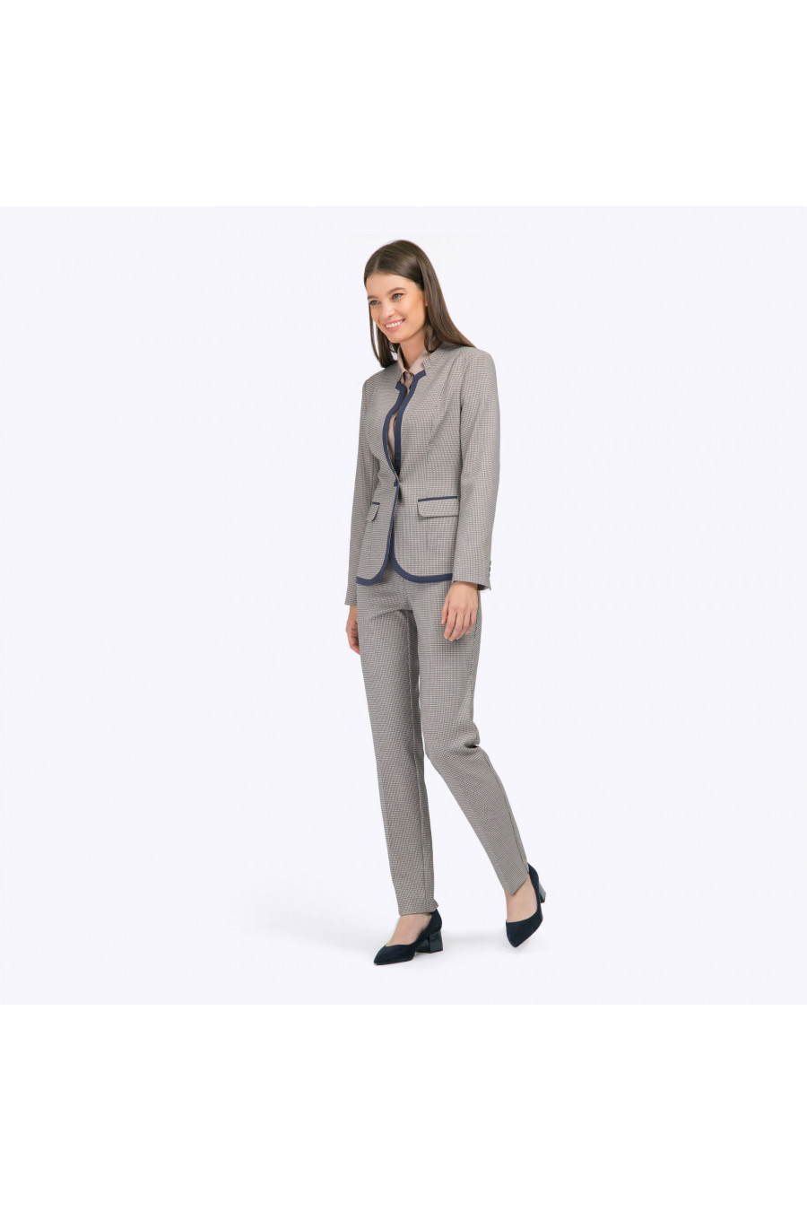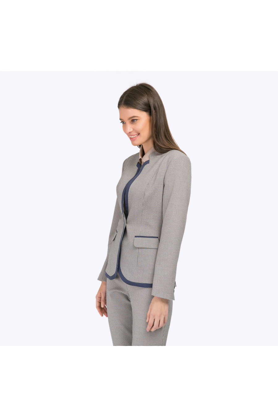ткани с мелким геометрическим принтом в сине-бело-жёлтой цветовойгамме. Модель полуприталенного силуэта, имеет имитацию ворота-стойки. Периметр полочек, клапаны карманов и прорезная пуговицы декорированы контрастным синим кантом. Рост фотомодели 177 см. Образ на фото дополнен Блузкой B2348-emika