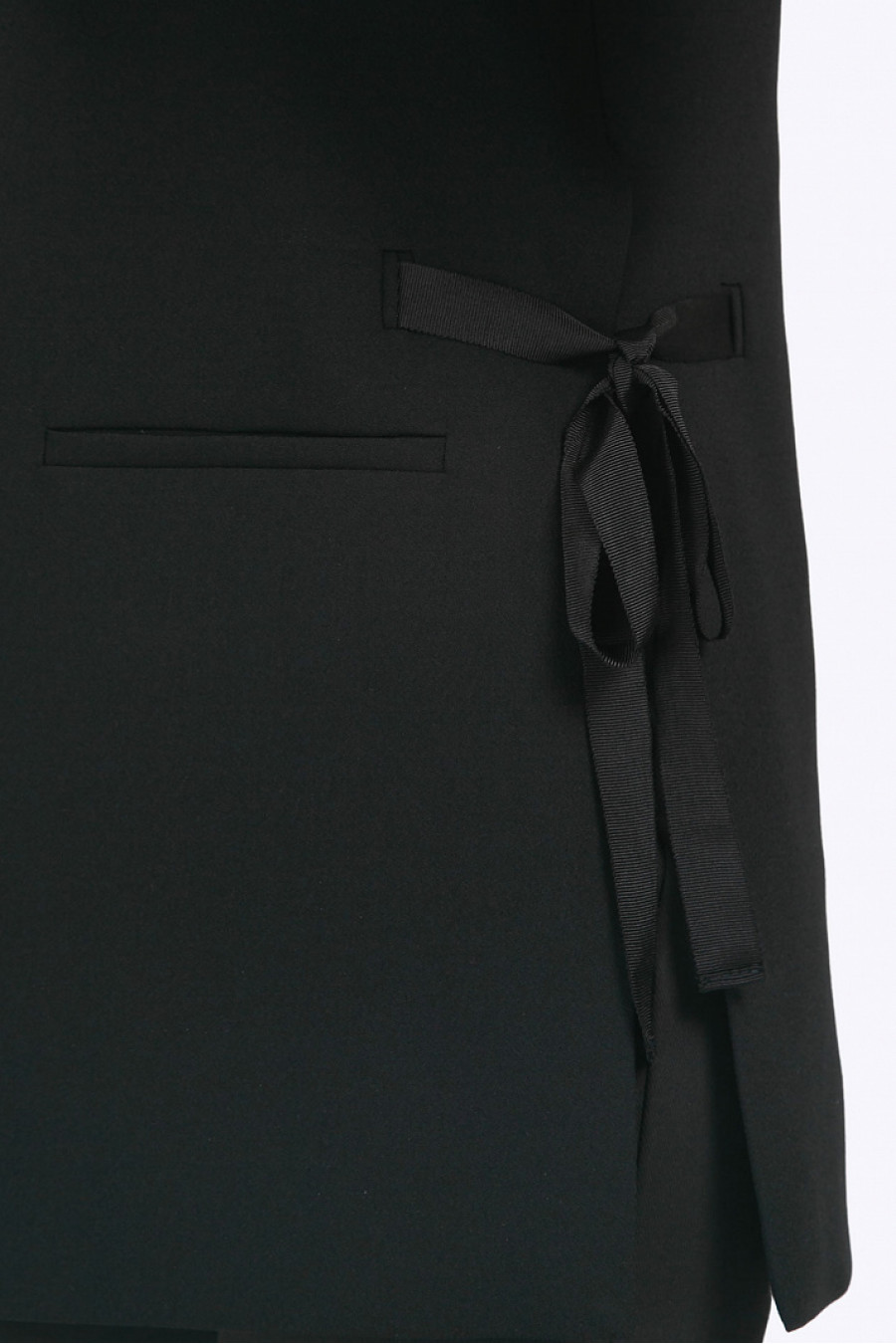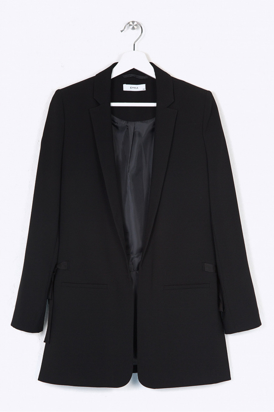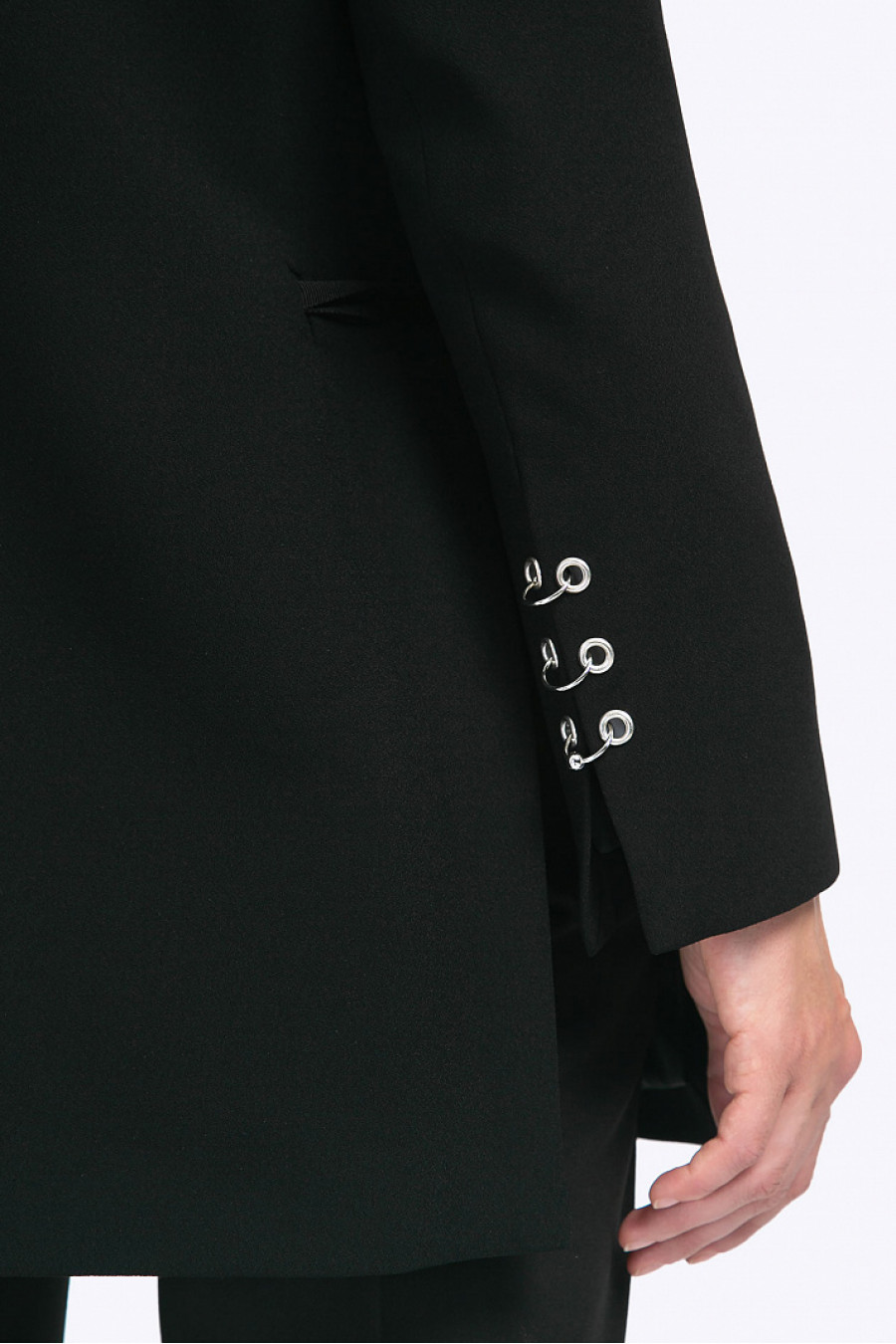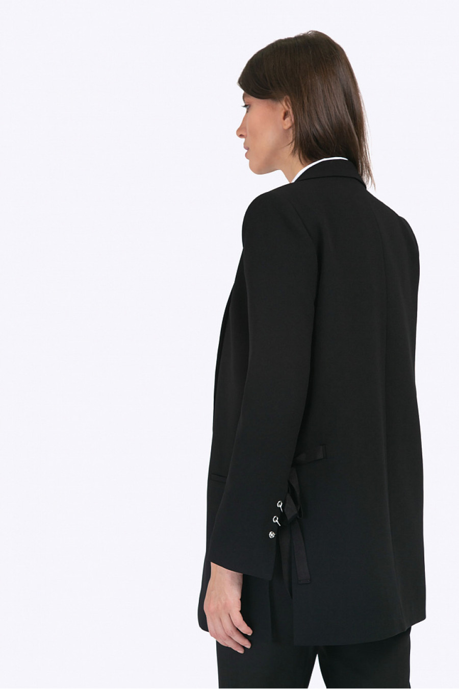Чёрный жакет на подкладке в стиле «деловой шик». Модель имеет прямой силуэт, классический английский воротник, спереди карманы с листочкой. По бокам расположены разрезы, декорированные завязывающейся на бант корсажной лентой. Рукава также имеют разрезы, дополненные металлическими элементами, имитирующими запонки.