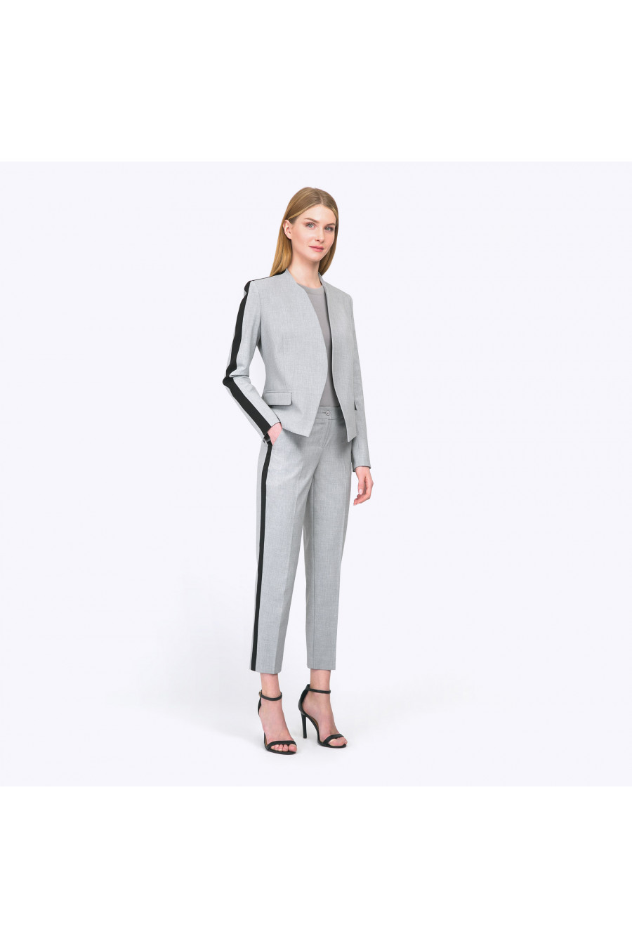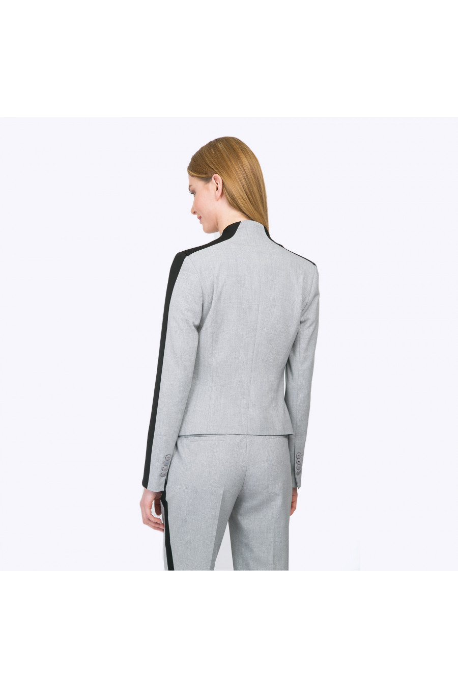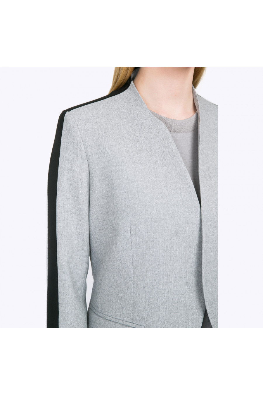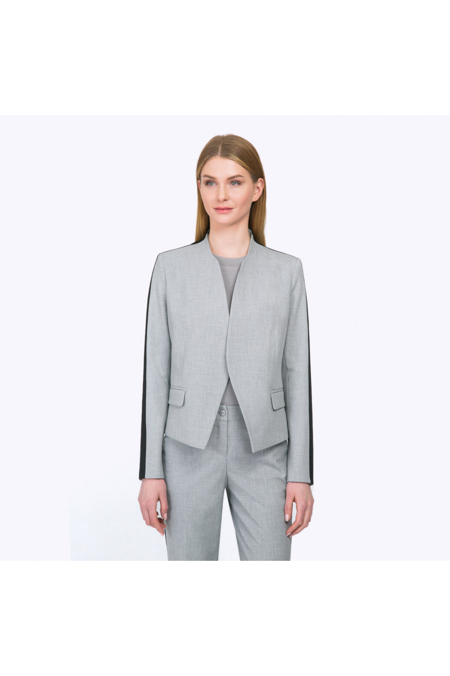 Укороченный серый жакет без пуговиц оригинального кроя. Лаконичная конструкция модели с плавными линиями в сочетании с неожиданным чёрным кантом вдоль рукава выглядит удивительно современно и свежо. В комплекте с базовой серой, чёрной или белой футболкой получаем гармоничный спортивно-деловой стиль. Образ на фото дополнен блузкой B2340-nastra