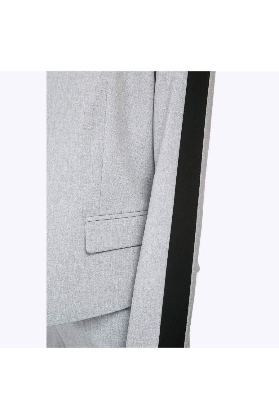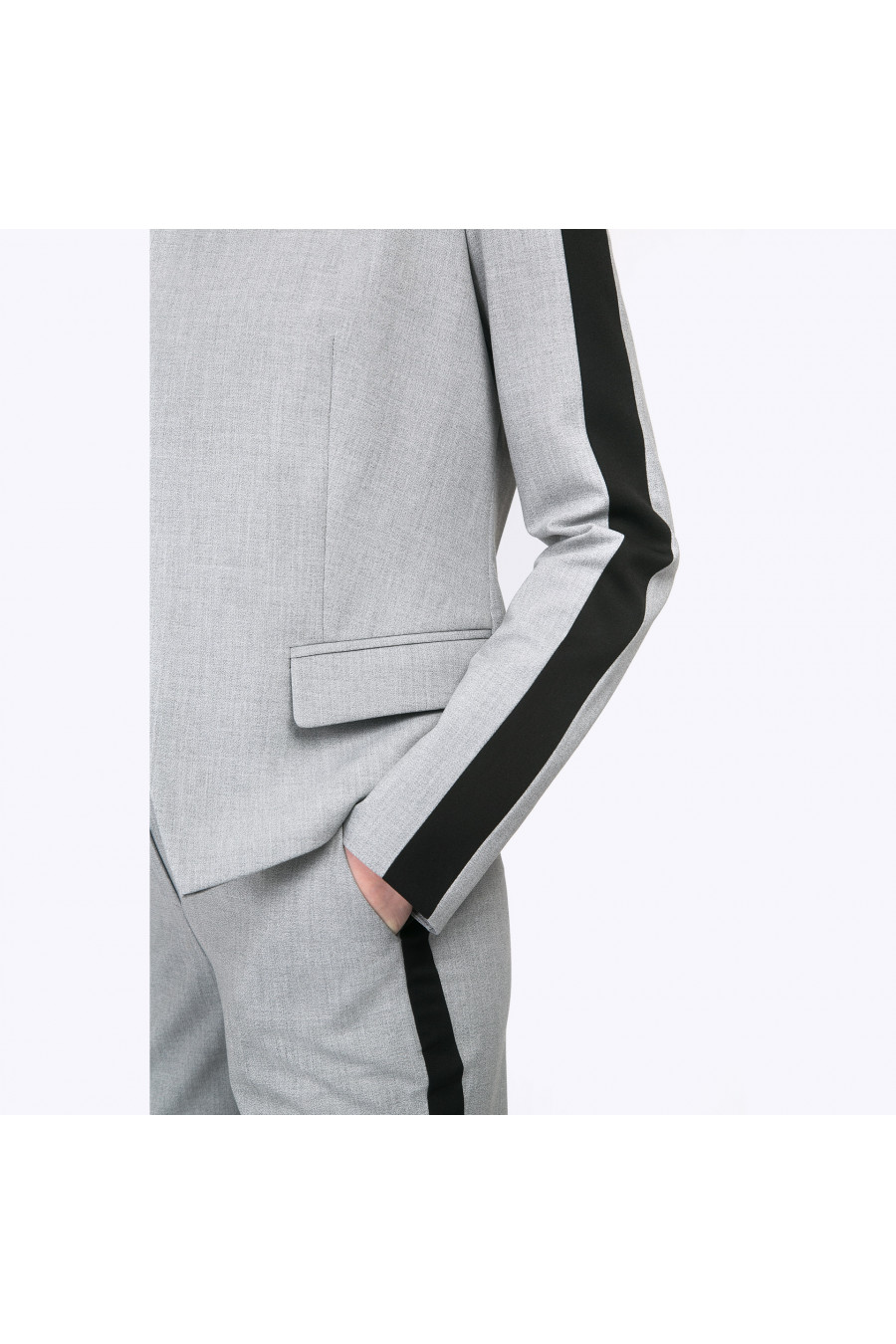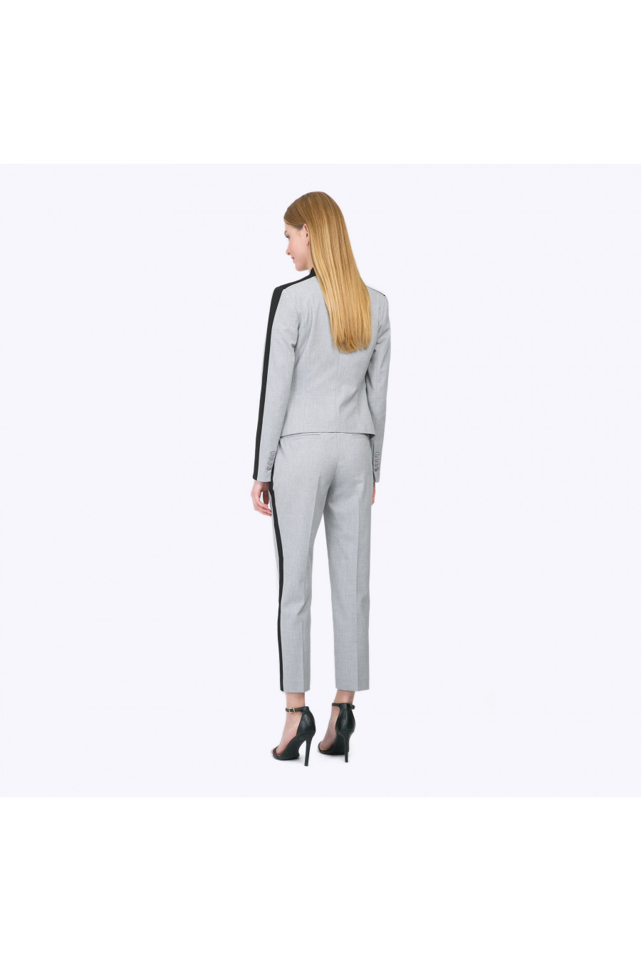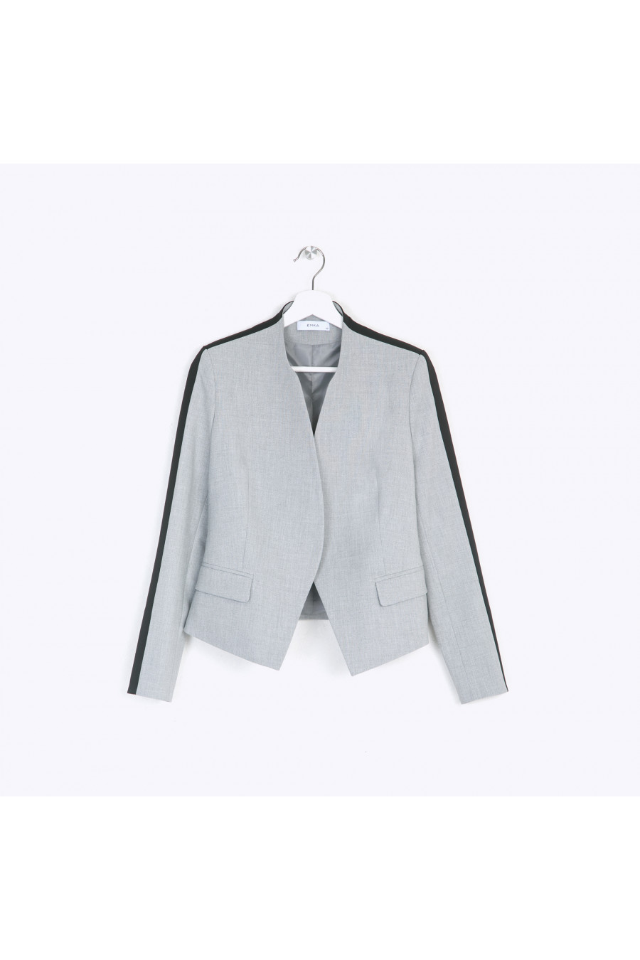 Укороченный серый жакет без пуговиц оригинального кроя. Лаконичная конструкция модели с плавными линиями в сочетании с неожиданным чёрным кантом вдоль рукава выглядит удивительно современно и свежо. В комплекте с базовой серой, чёрной или белой футболкой получаем гармоничный спортивно-деловой стиль. Образ на фото дополнен блузкой B2340-nastra
