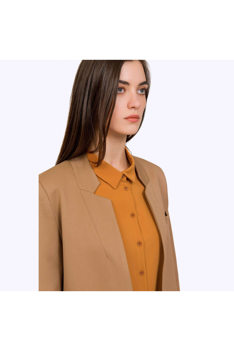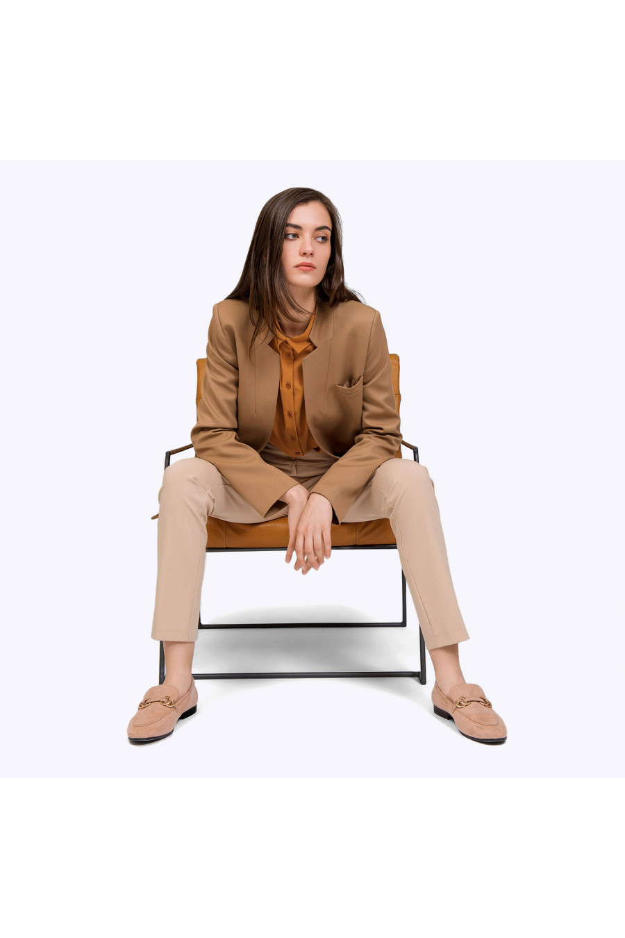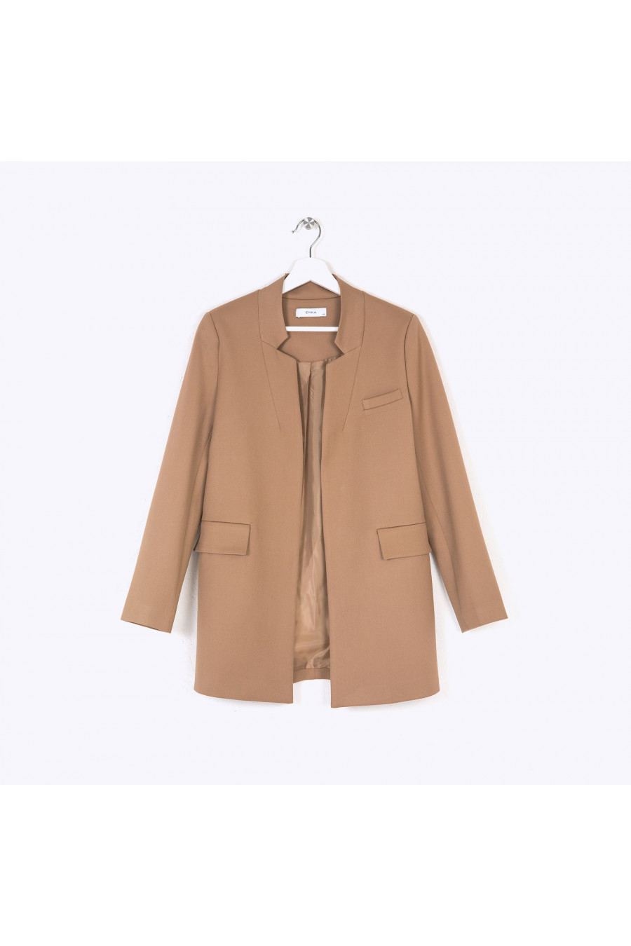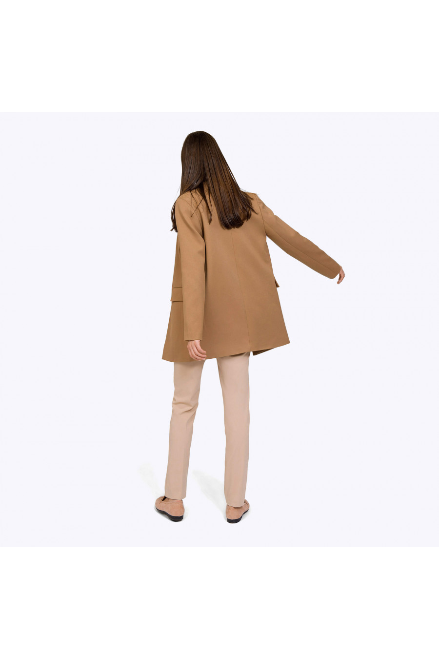 Удлинённый бежевый жакет на подкладке. Модель прямого силуэта,выполнена без застёжки. Передние полочки дополнены нагрудным карманом с листочкойи карманам с крупными клапанами. Особую изюминку модели придаёт оригинальное конструктивное решение фигурно выполненного воротника. Образ на фото дополнен брюками D052-jardin