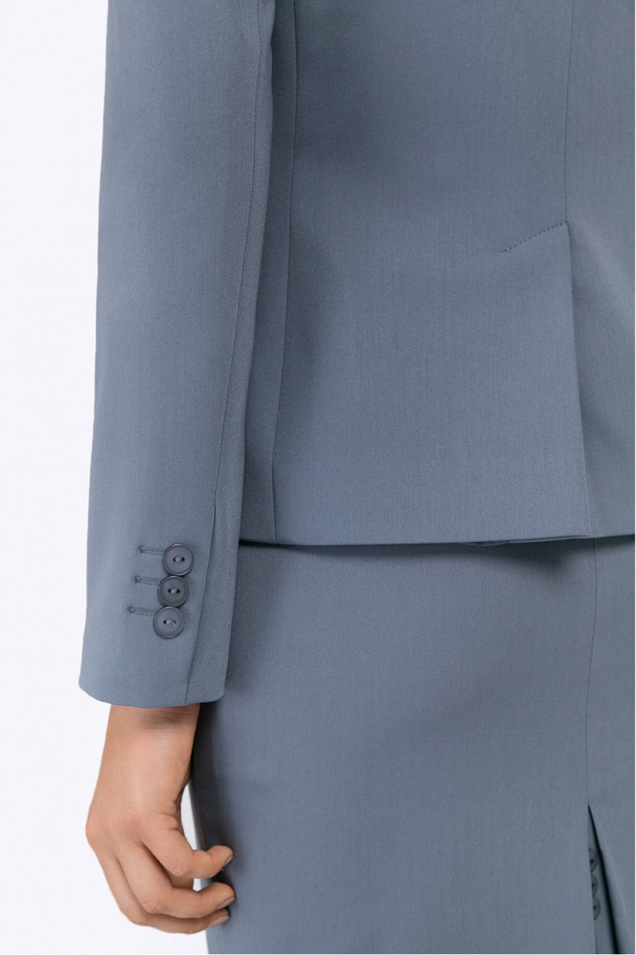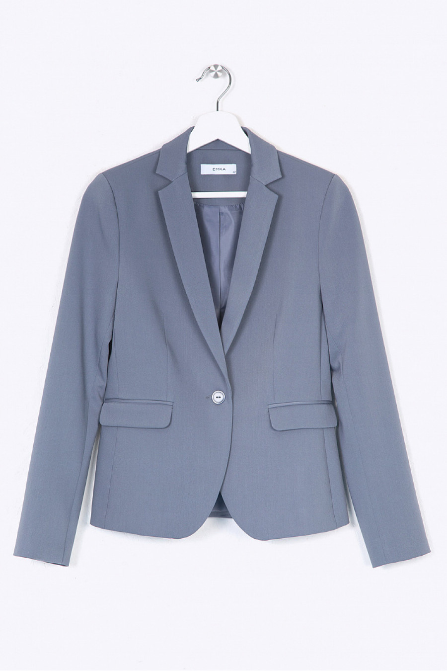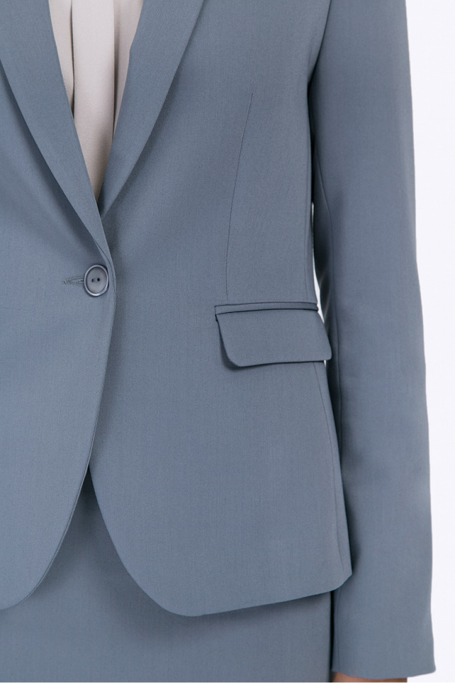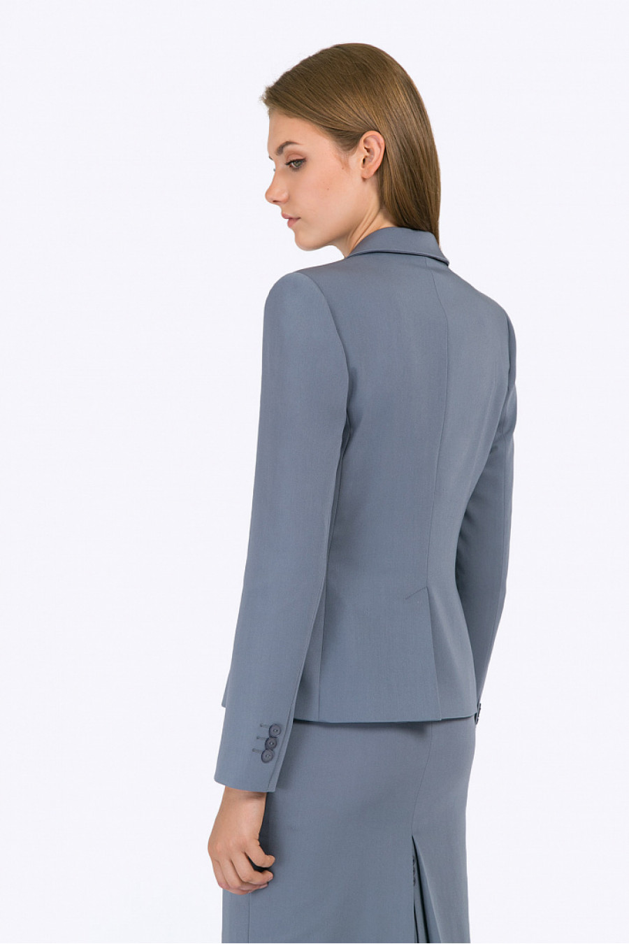 Серый однобортный жакет на подкладке. Модель полуприталенного силуэта, имеет классический английский воротник, спереди расположены карманы с клапанами, на спинке в срединном шве высокая шлица. Застёгивается на одну пуговицу. Образ на фото дополнен юбкой S369-iveta , блузкой B2288-nine . Рост фотомодели 177 см.
