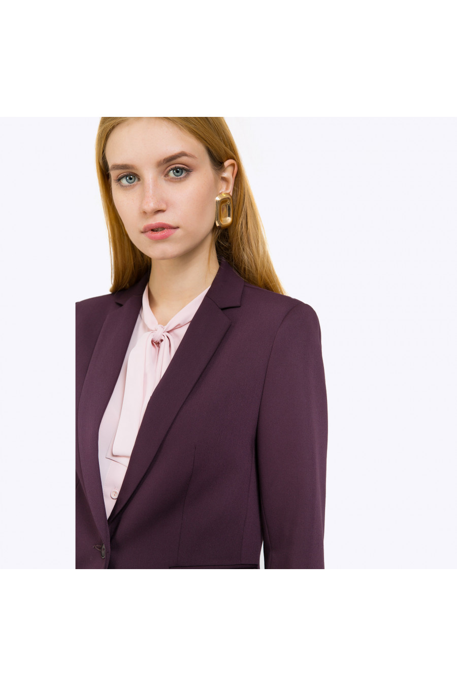 классических деловых образов. Модель полуприталенного силуэта, до середины бедра, санглийским воротником. Застёгивается на одну пуговицу. Спереди расположены карманы