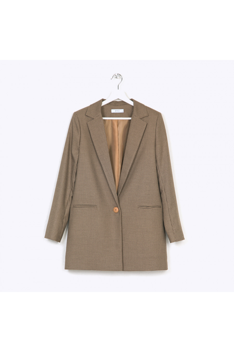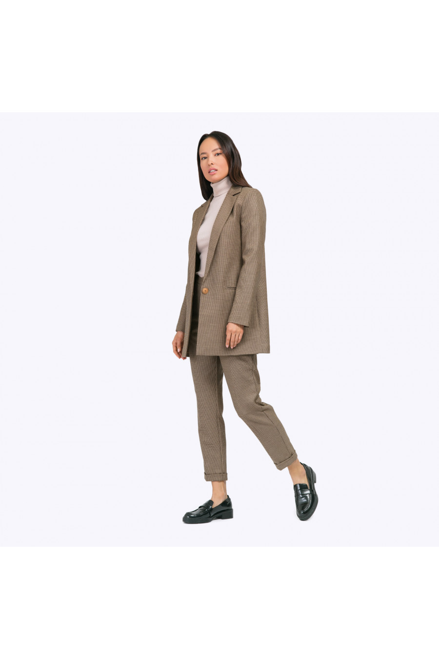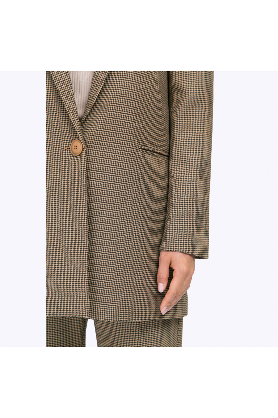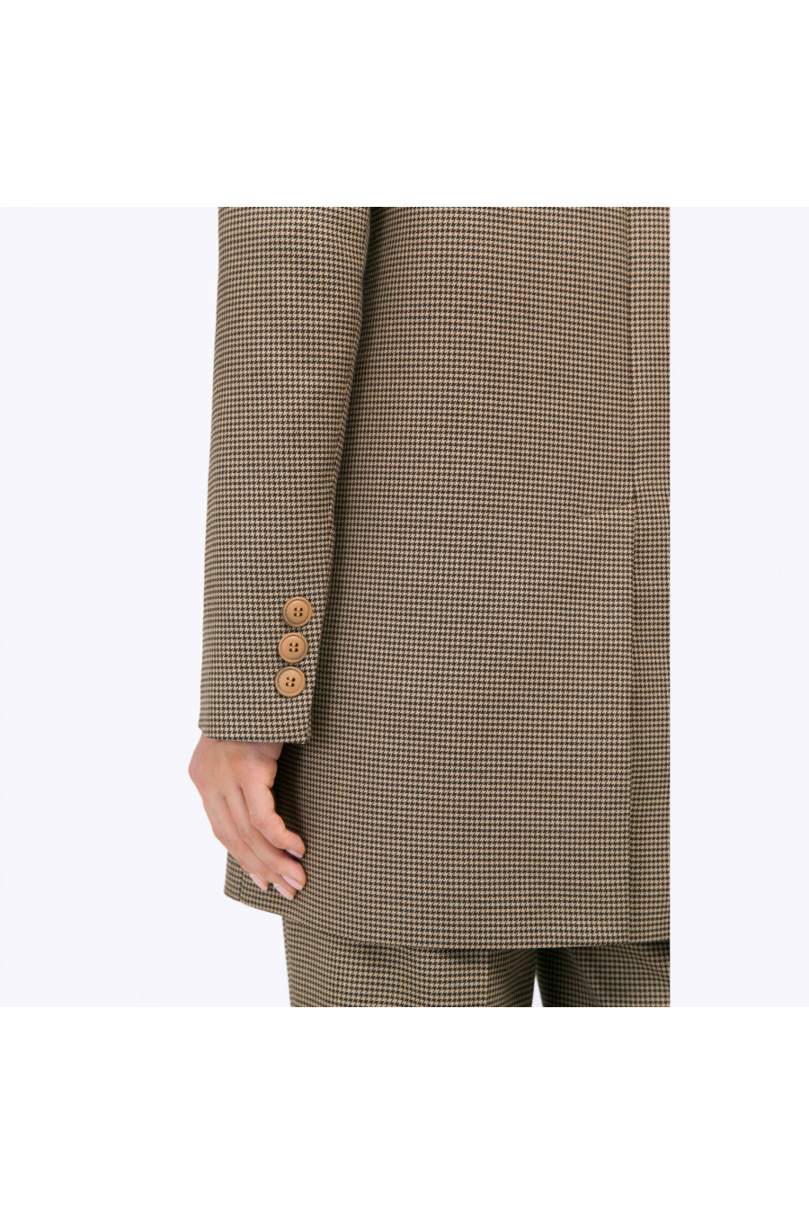 Длинный однобортный жакет с классическим орнаментом «пье-де-пуль» втёплых бежево-коричневых тонах. Модель на подкладке, имеет прямые строгие линии,центральную бортовую застёжку с крупной пуговицей, английский воротник, карманы слисточкой, сзади высокую шлицу. Рукава дополнены тремя мелкими пуговичками. Образ на фото дополнен блузкой B2285-paldim