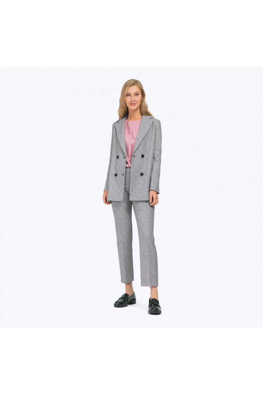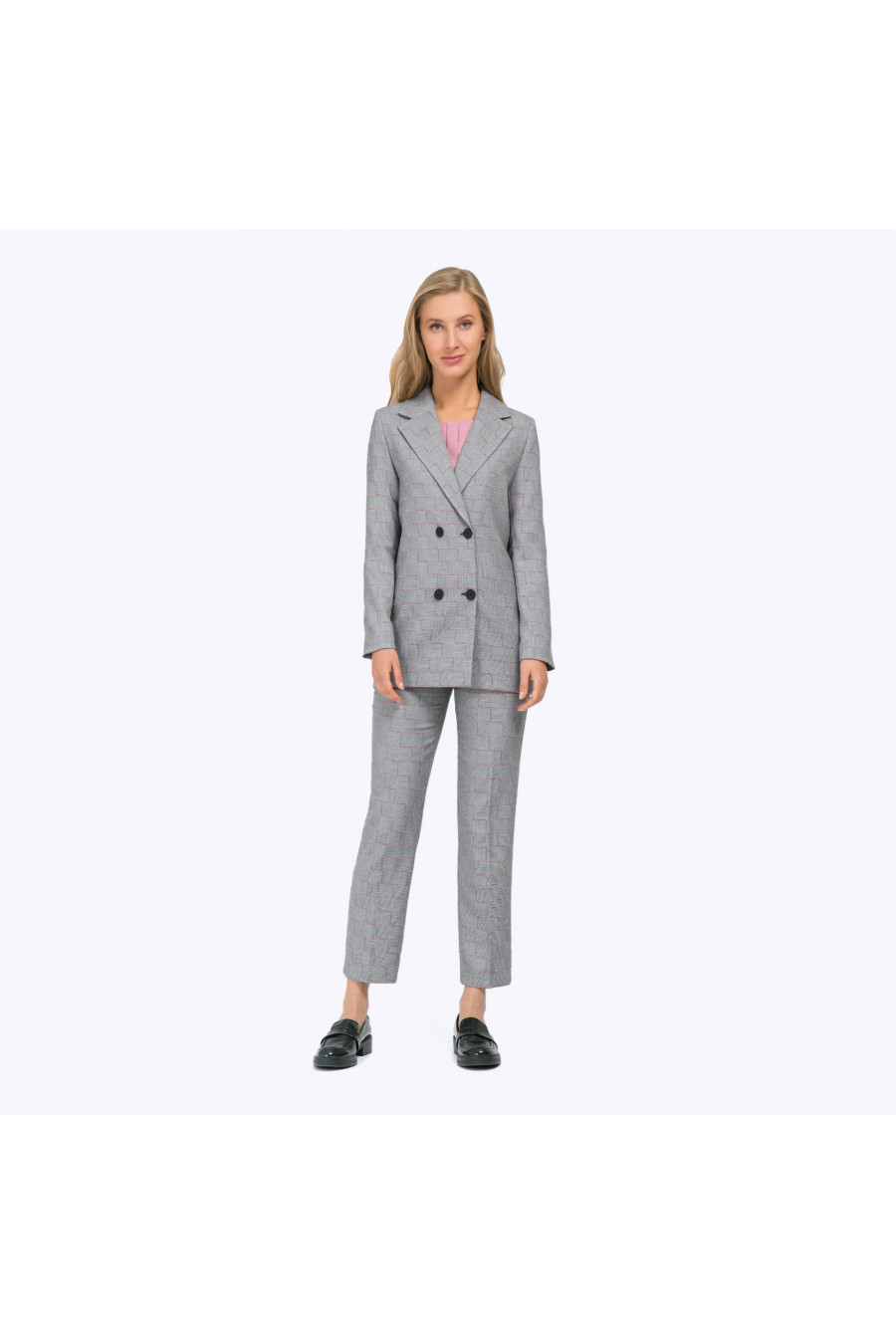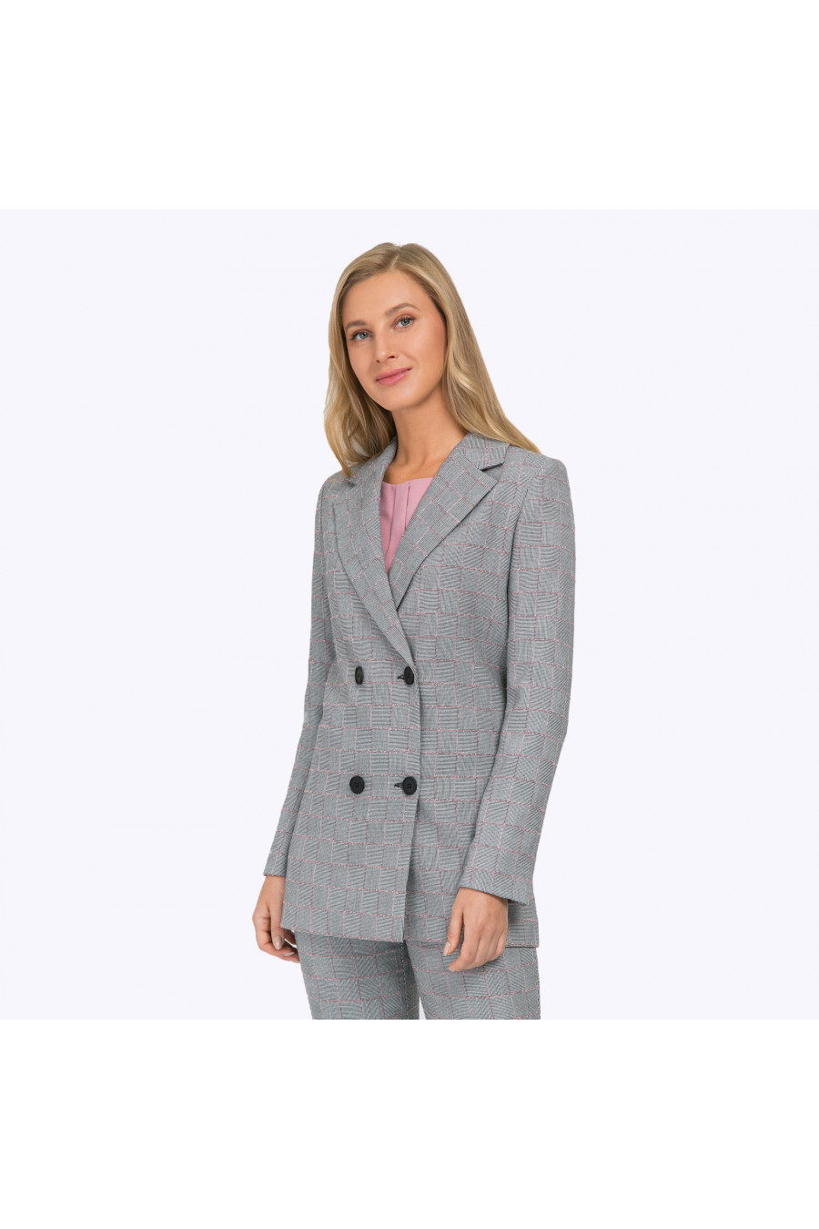 Жакет из фактурной ткани в чёрно-белую клетку, разбавленную розовойнитью, создающей буклированный эффект. Модель прямого силуэта, с классическиманглийским воротником, карманами в боковых швах. Сзади имеется небольшая шлица. Образ на фото дополнен блузкой B2288-zayn