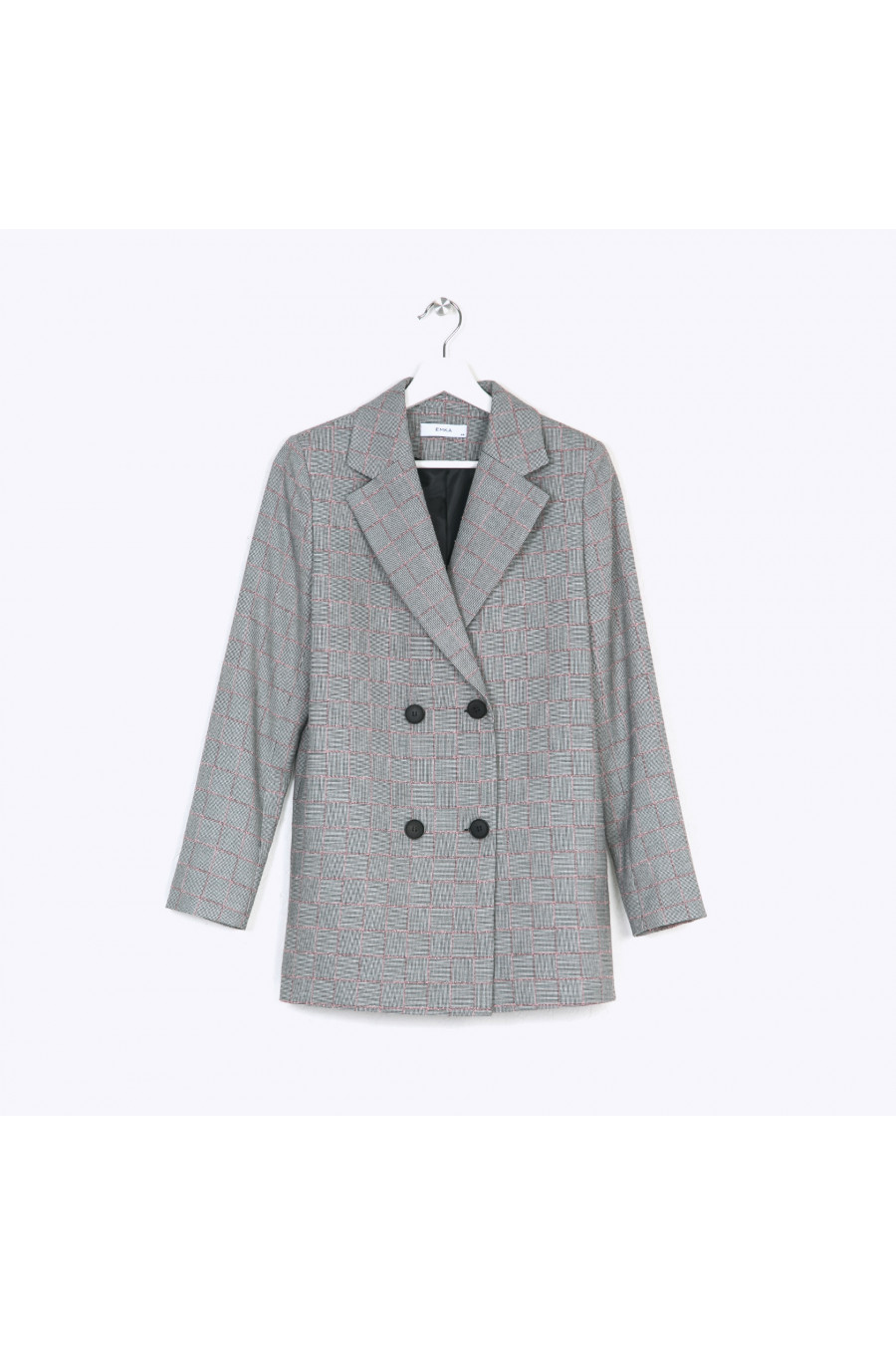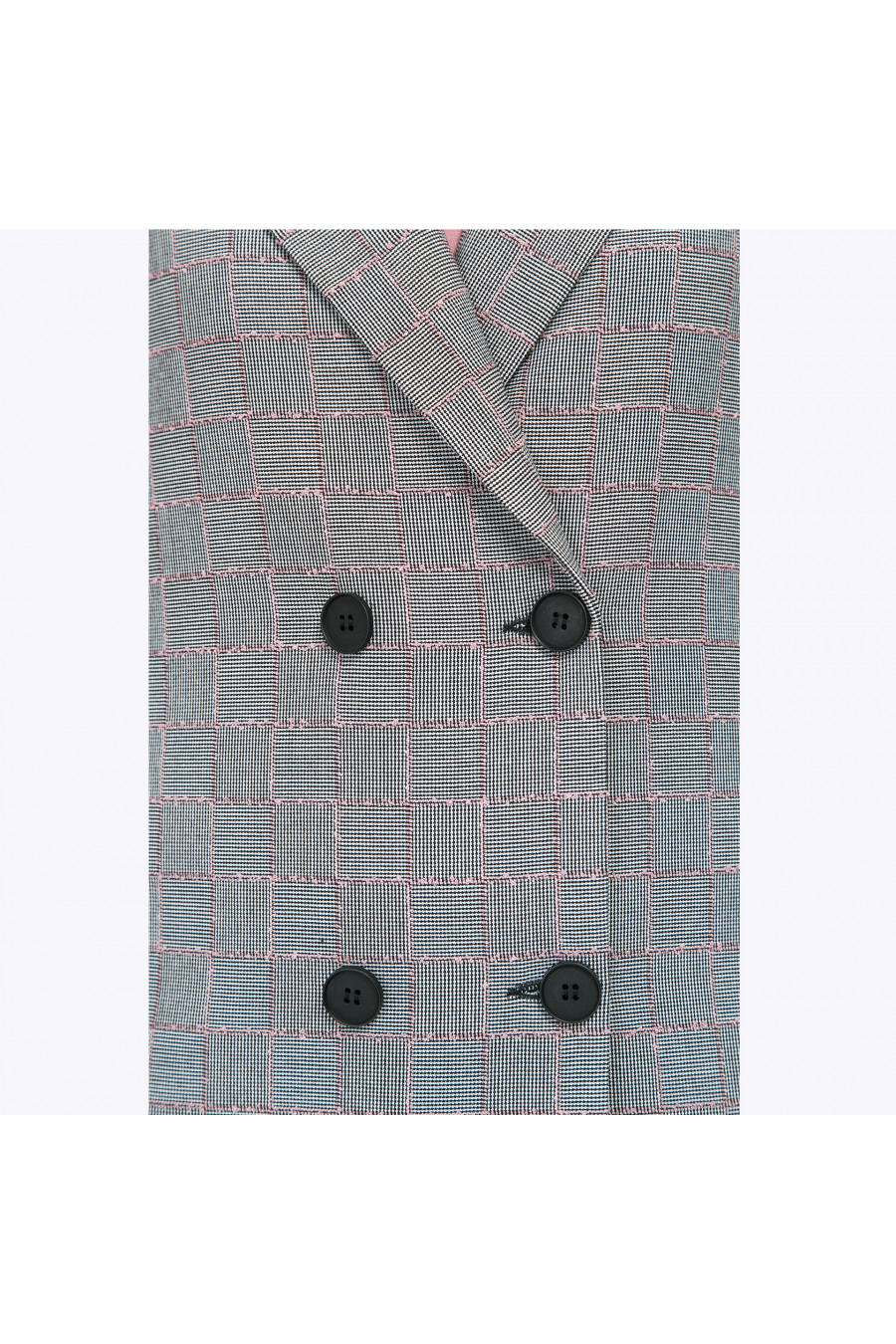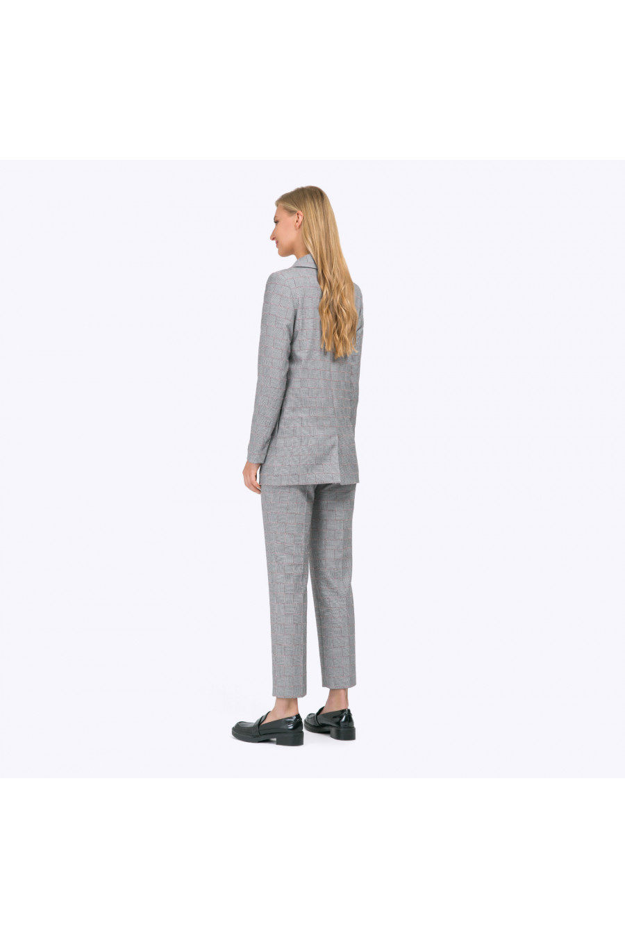 Жакет из фактурной ткани в чёрно-белую клетку, разбавленную розовойнитью, создающей буклированный эффект. Модель прямого силуэта, с классическиманглийским воротником, карманами в боковых швах. Сзади имеется небольшая шлица. Образ на фото дополнен блузкой B2288-zayn