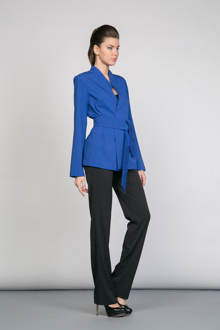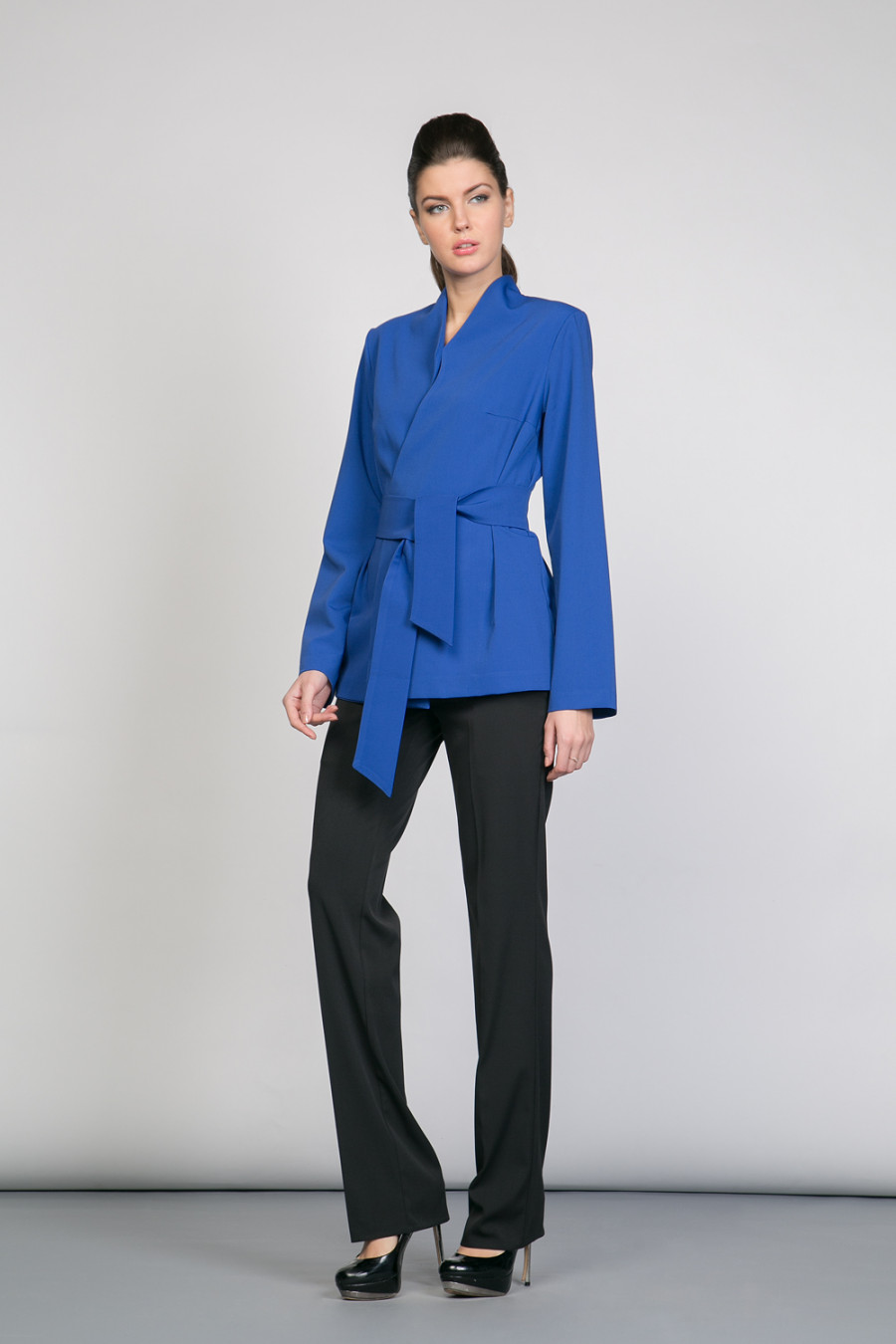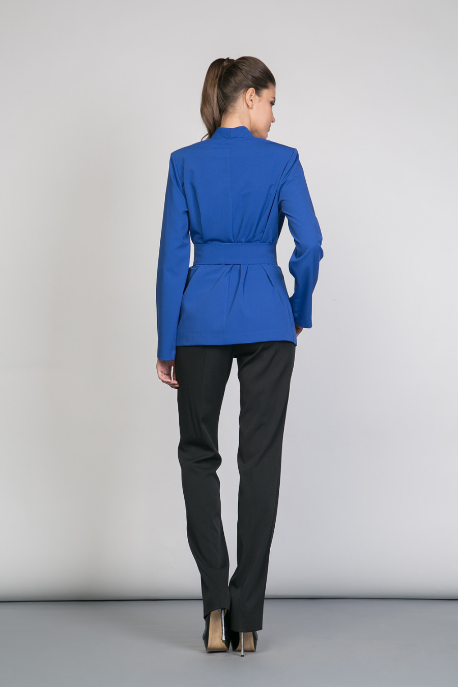 Утонченный женский жакет с поясом на талии. Длинный рукав, воротник- стойка.
