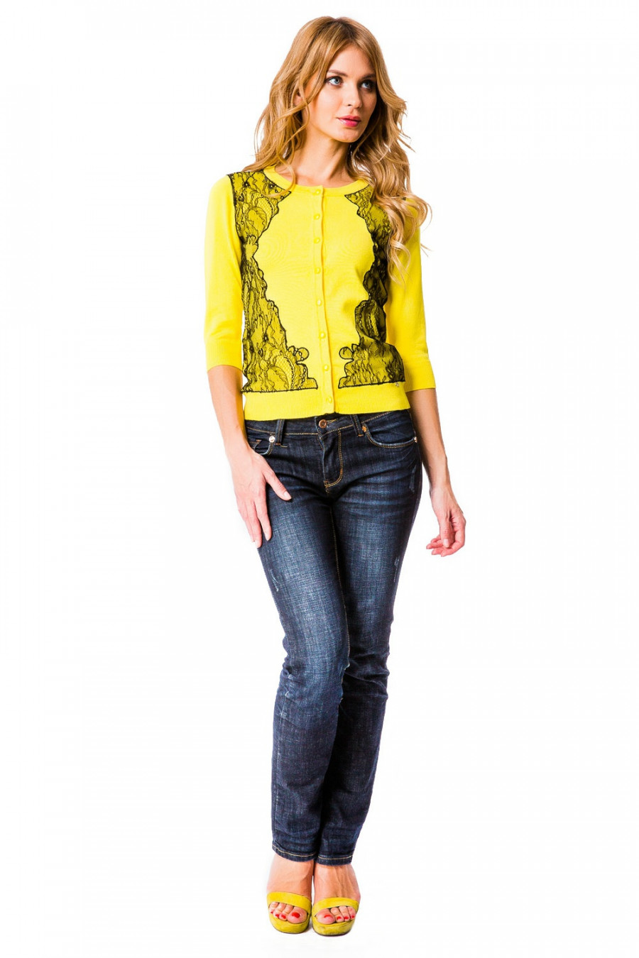 Великолепный жакет с застежкой на пуговицы облегающего комфортного кроя, выполненный из материала тонкой вязки. Модель с округлым вырезом горловины и рукавами 3/4. На передней части модель декорирована ажурной вставкой. Нежное трикотажное полотно высочайшего качества мягко прилегает к телу. Эффектный декор кружевом придаёт Вам неземное очарование!