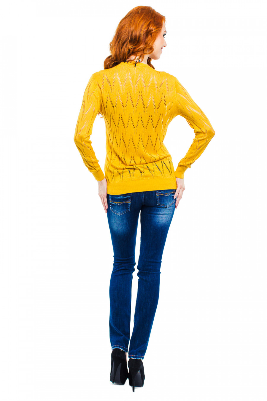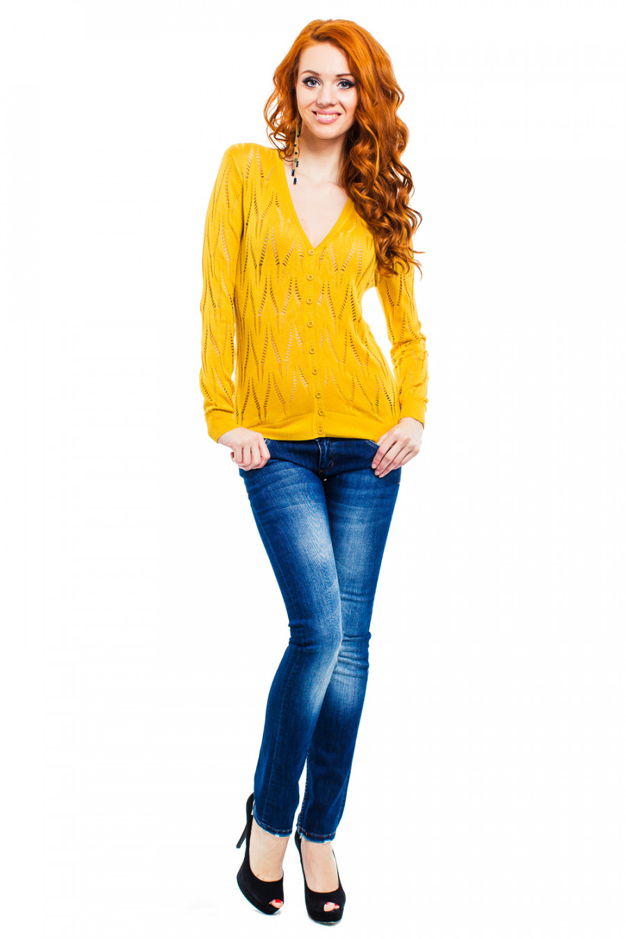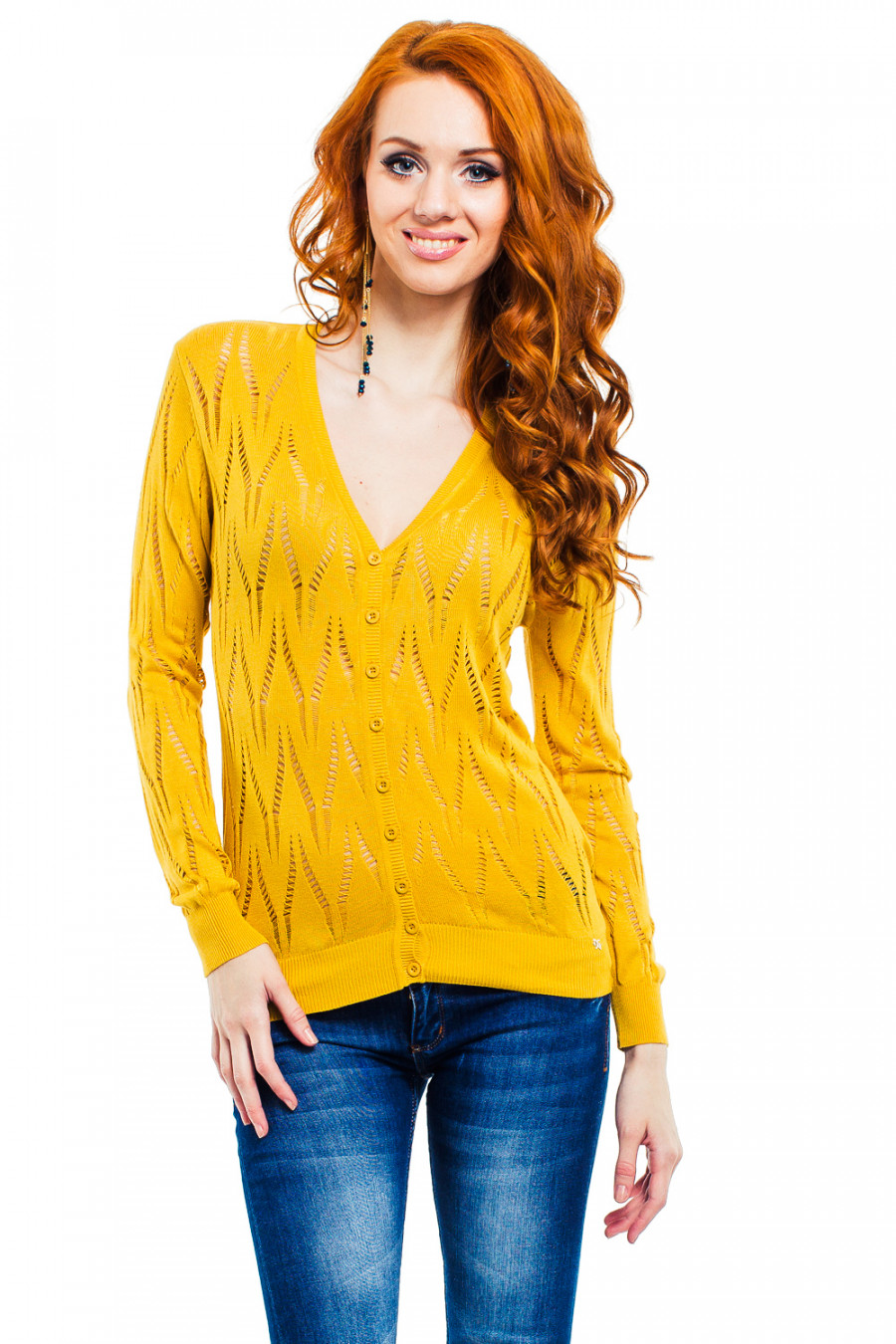Женственный жакет представлен в нежных расцветках с длинными рукавами и V-образным вырезом. Изделие выполнено из модной в этом сезоне кружевной вязки, застежка на пуговицы.